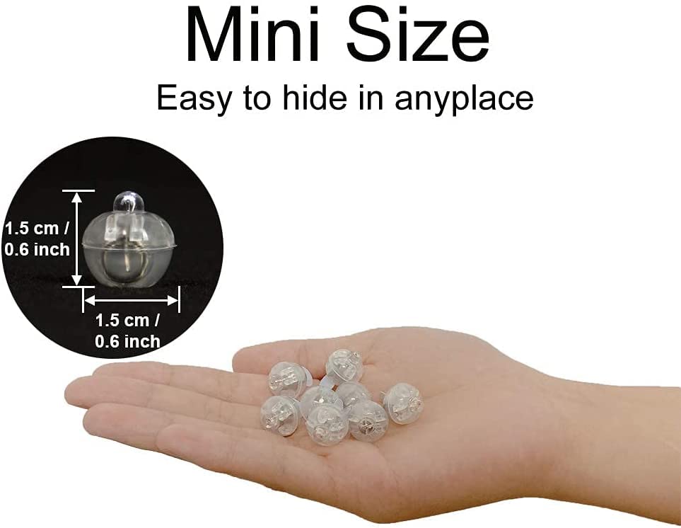 Q: What is the size of each LED balloon light?A: Each LED balloon light has a diameter of about one point seven centimeters. This mini size makes them easy to fit inside various decorations.