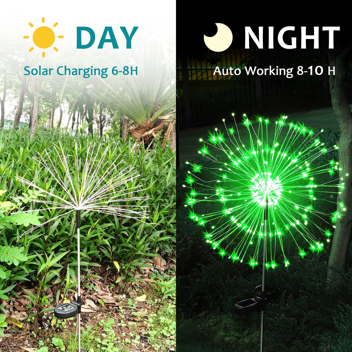 Solar Garden Lights Outdoor Decoration Fireworks Our Garden Lights Use 50 High-Quality Copper Wires, These Copper Wires Are Flexible And Could Be Easily Curled To Meet Your Needs. These Copper Wires Are Flexible, Decorate Your Room To Enjoy The Atmosphere Of Relaxing, Memorize Your Important Moment In The Wedding. Also Suitable For The Shop, School, Garden Decoration. Feature: - Waterproof Class Is Ip65; They Work Well Under All Kinds Of Weather, No Worries About Exposing To Rain Or Snow. - Diy Your Favorite Shapes Such As Flowers, Trees, Fireworks, Ferris Wheels, Hearts, Spirals, Spheres, Etc. - Working Modes: Steady On / Flash (Put The Switch Into ?N Change Different Modes Use ''Mode'' Button) - Build With Automatic Light Sensor Function, The Solar Lights Auto Turn On At Night. - Decorate Any Celebrating Occasions With These Amazing Garden Lights, Add A Romantic, Moving Atmosphere To Your Garden Specifications: Brightness: About 150 Lm Power: 6W Led Quantity: 150 Leds Material: Copper Wire + Stainless Steel + Plastic Working Time: 8-10 Hours Lighting Time After 6-8 Hours Full Sunlight Charging. Working Mode: Light Control,On / Off/ Twinkling Tips: 1. If The Solar Light Does Not Light Up When You Receive Your Package, Please Charging In The Sun And Then Take It To A Completely Dark Room To See Whether It Will Light Up, If No, Please Contact Us For Replacement. 2. Remove The Protective Film (Protect Panels) On The Solar Panel Before Charging 3. Ensure The Bottom ?Nwhen Charging 4. Install The Solar Light Outdoors, Adjust The Angle Of The Solar Panel To Make Sure It Can Absorb Maximum Sunlight 5. Ip65 Waterproof, But It Does Not Support Underwater Use. Please Do Not Immerse The Product In Water. Package: - 2 X Led Solar Firework Lights - 1 X User Manual