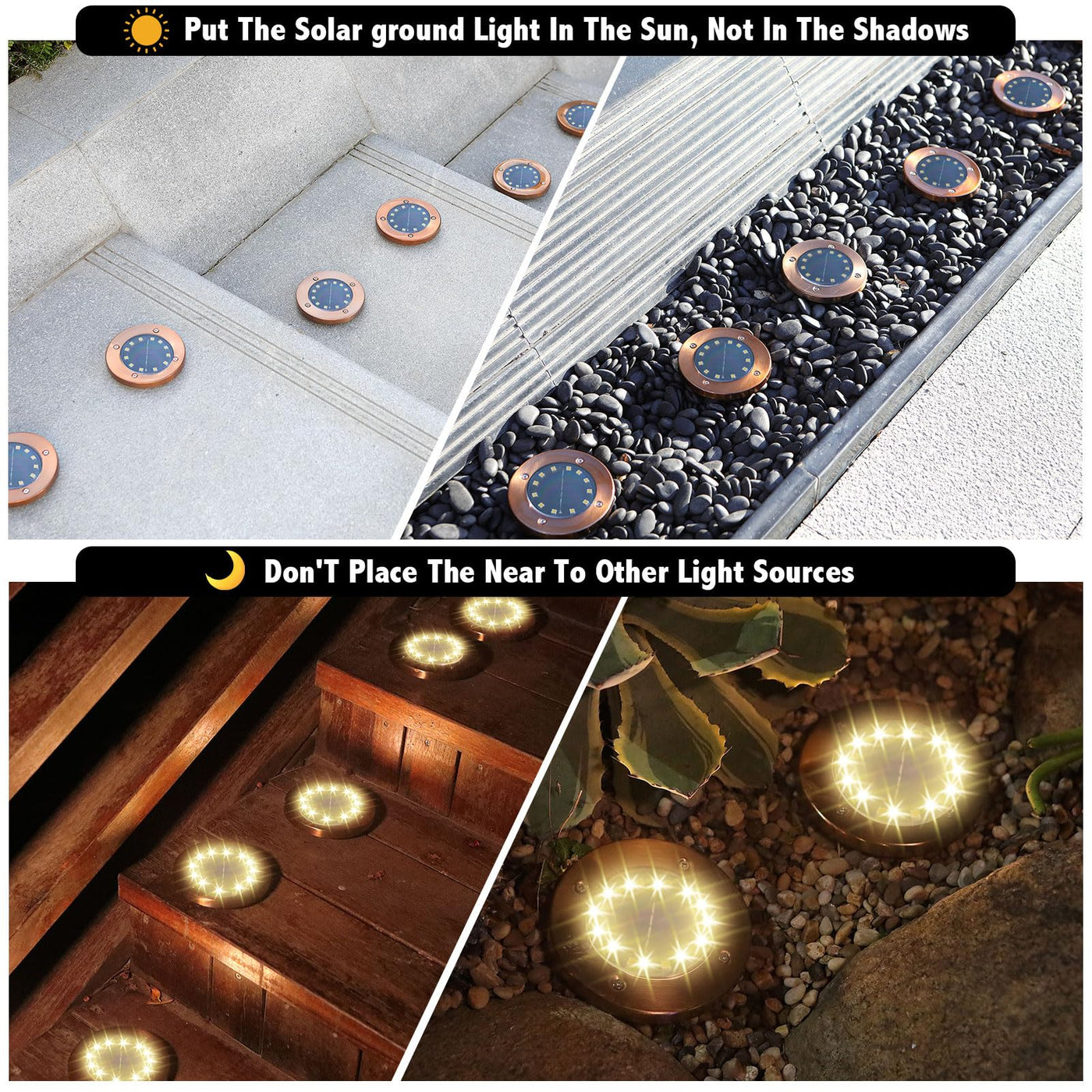 Q: What is the brightness level of these solar disk lights?A: The JKIMK Solar Ground Lights feature 12 LED lights, providing a higher brightness level compared to other products that typically have only 8 LED lights.