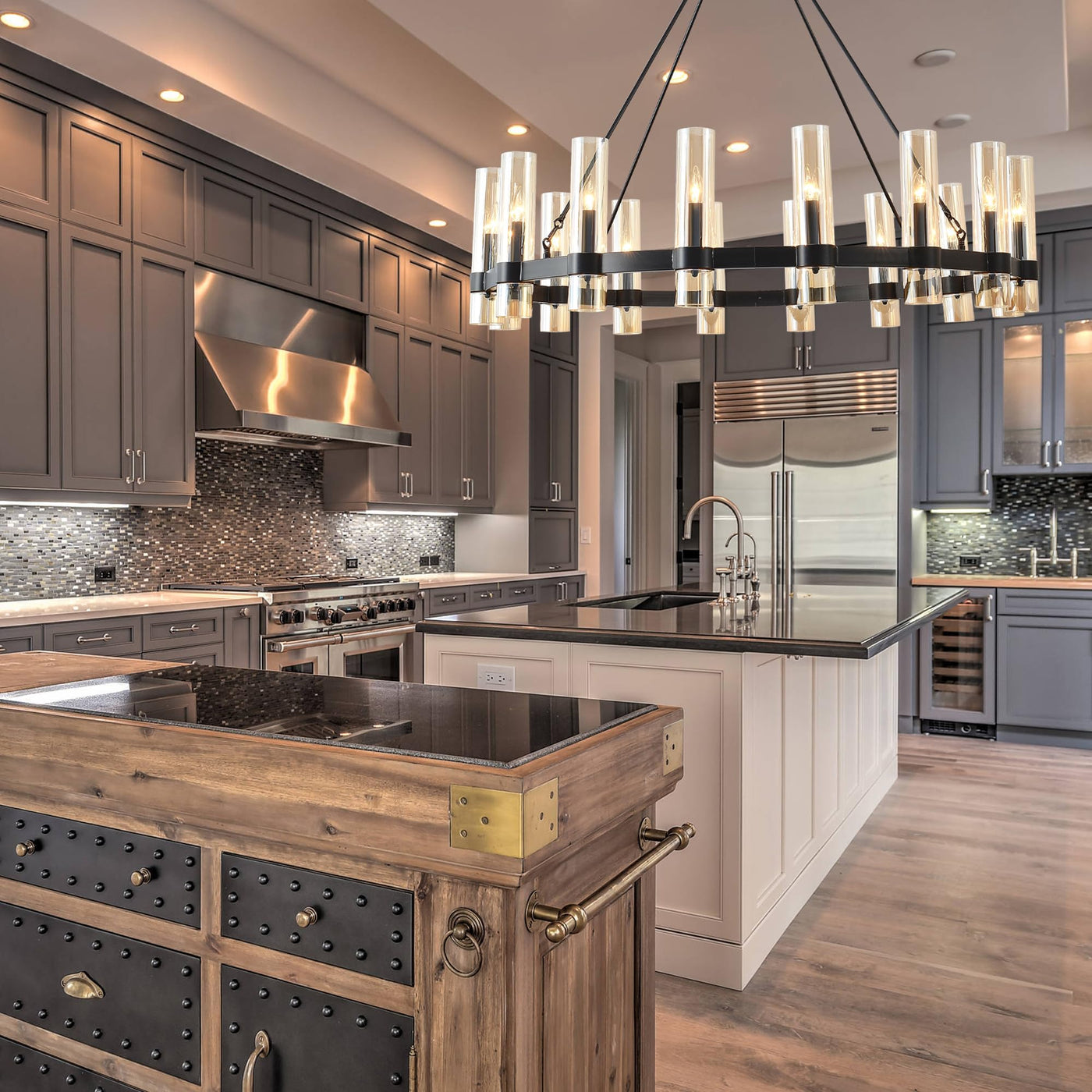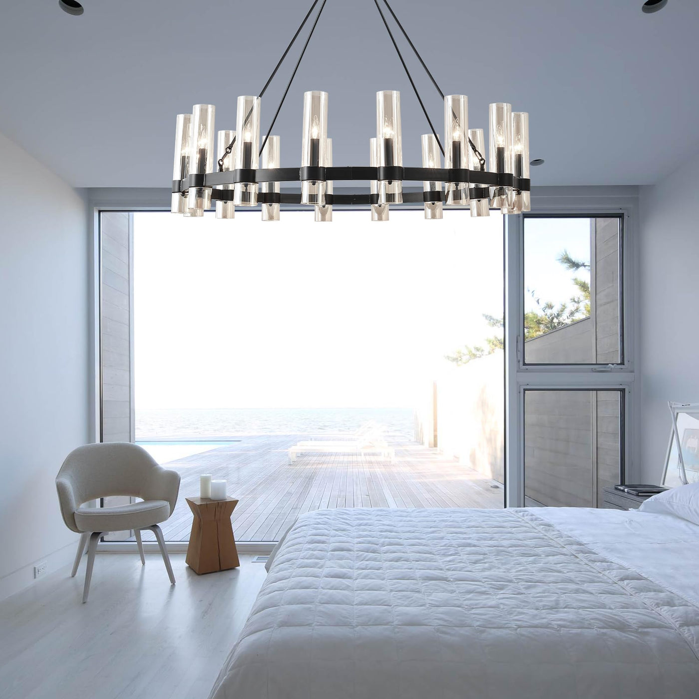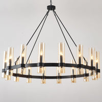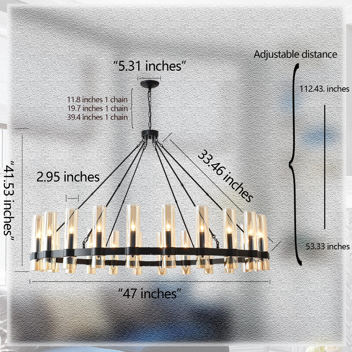 Transform your space with this striking 48-inch black wagon wheel chandelier, a perfect blend of rustic charm and modern elegance. Featuring 16 lights adorned with beautiful brown glass shades, this chandelier creates a warm, inviting atmosphere while making a bold statement. The grand scale makes it particularly well-suited for spaces with high ceilings, whether it's anchoring your dining room, illuminating your kitchen, or welcoming guests in your foyer or entryway. The classic wagon wheel design adds a touch of farmhouse appeal while maintaining sophisticated appeal that works with various decor styles. The substantial size and multiple light sources ensure ample illumination for your space, while the thoughtfully designed brown glass shades help create the perfect ambiance. This chandelier serves as both a functional lighting solution and a stunning focal point that will draw admiring glances from visitors.
