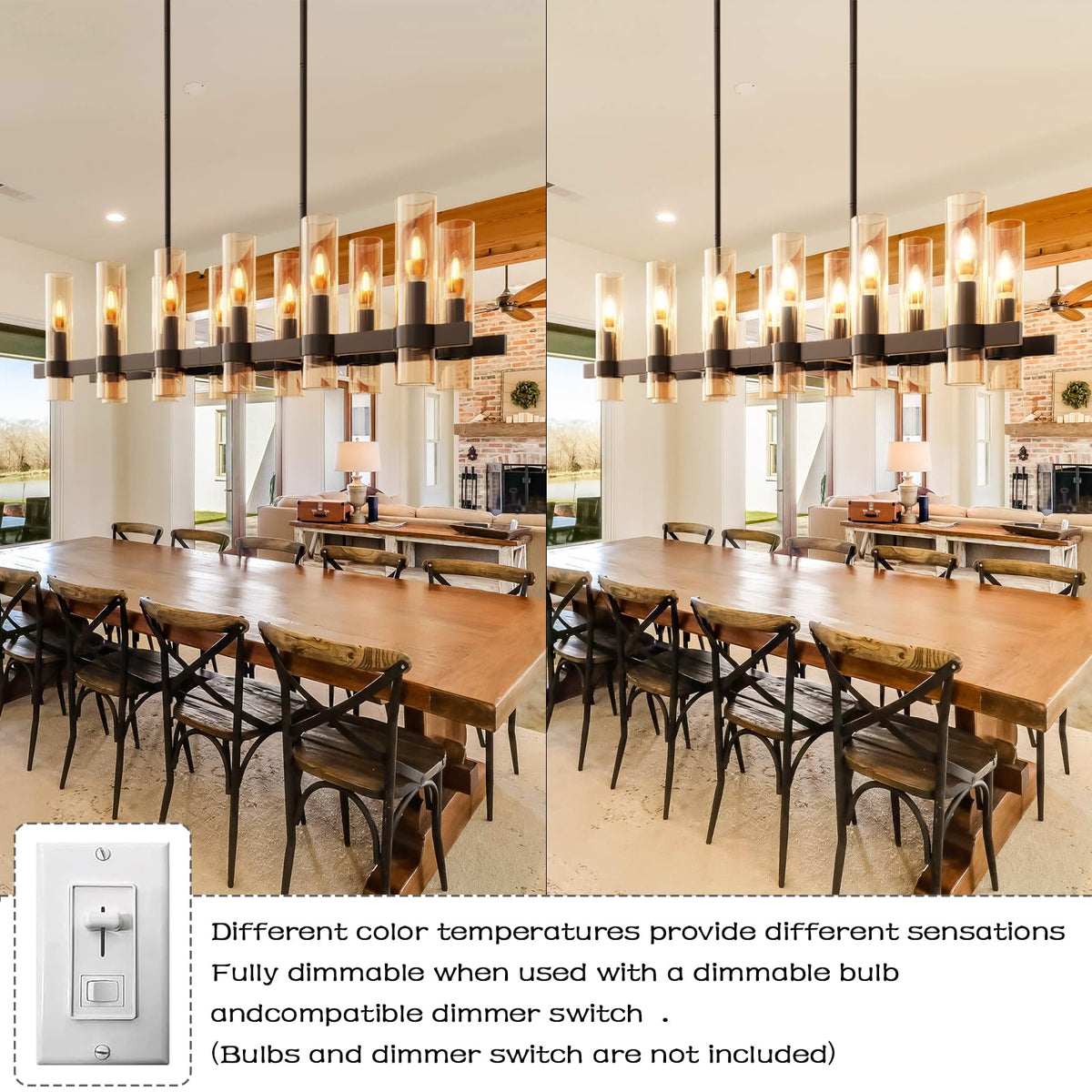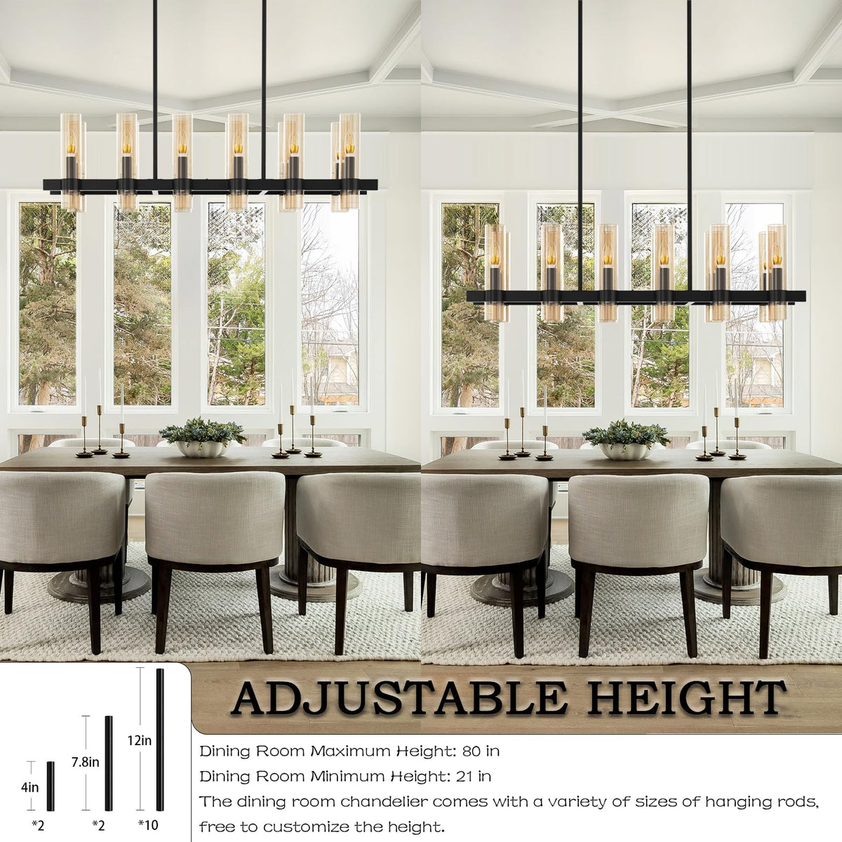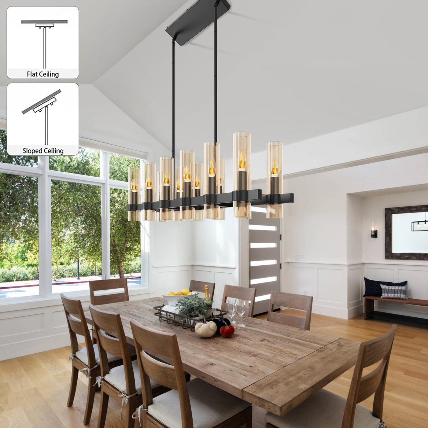 Jklx Modern Black Island Rectangle Chandelier With Amber Glass,48 Adjustable Height Modern Linear Light Fixture 12 Light Dini