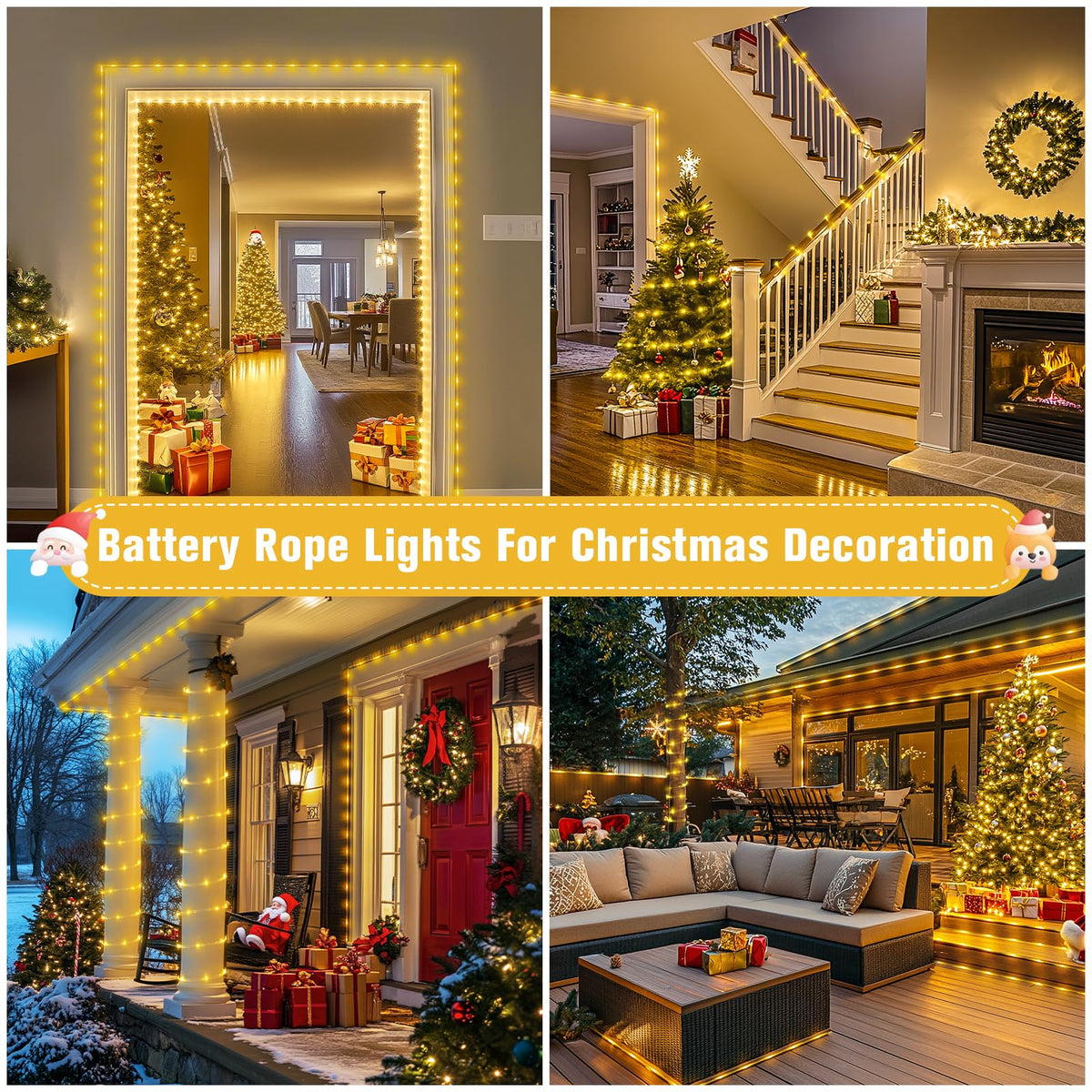 Q: Is it safe to use these lights indoors?A: Yes, the JMEXSUSS Battery Operated Rope Lights are safe for indoor use, as they do not require a power outlet and are designed to be safer than traditional plug-in string lights.