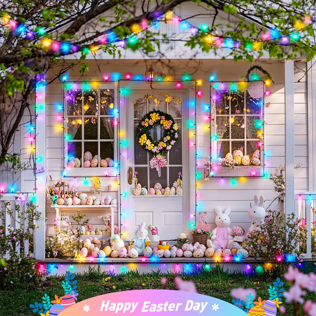 Q: How long is each string of the JMEXSUSS Easter lights?A: Each string of JMEXSUSS Easter lights is 33 feet long and contains 100 LED lights, providing ample length for various decorating needs.