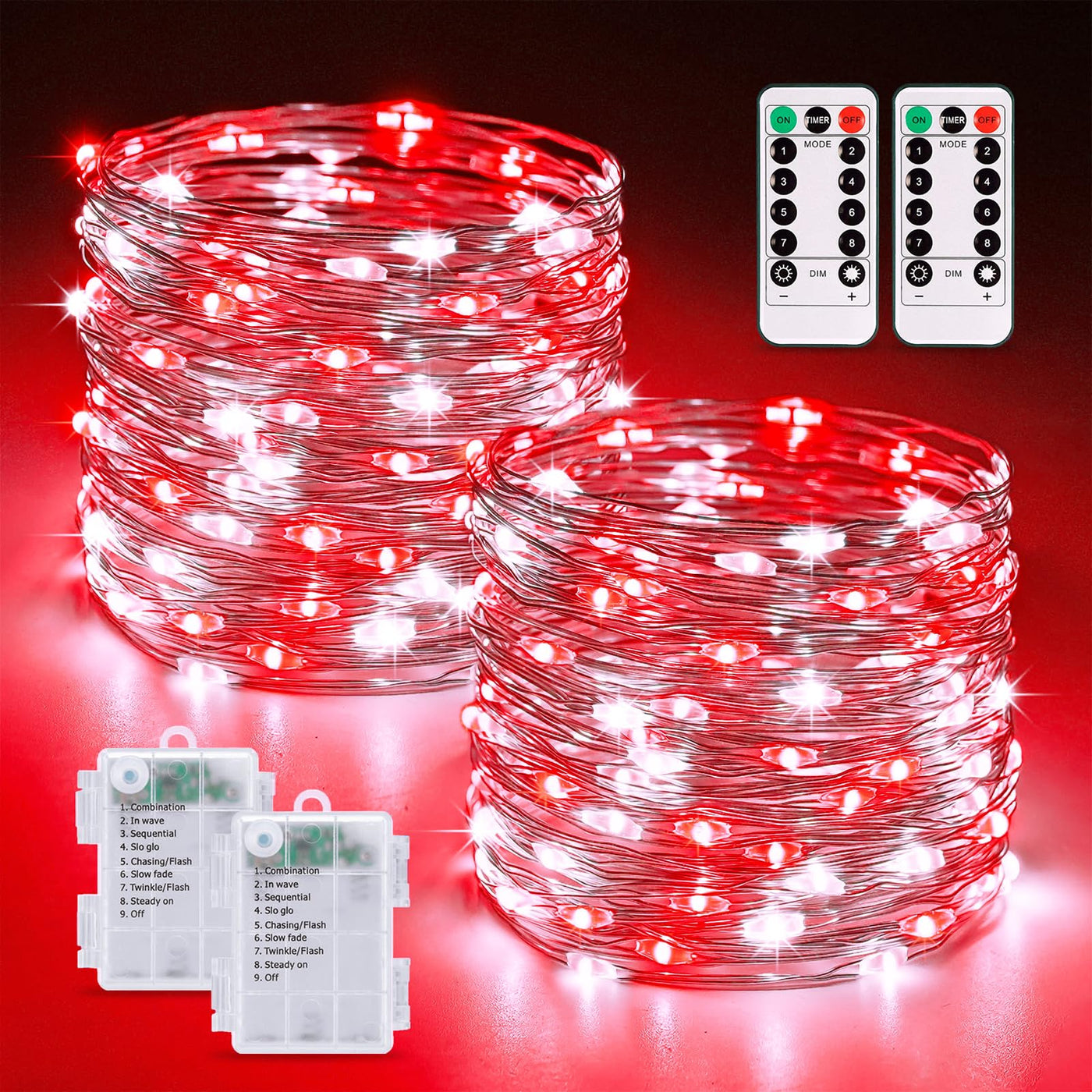 JMEXSUSS 2 Pack Red and White Fairy Lights Battery Operated, Total 200LED 66ft Red and White Christmas Lights with Remote, 8 Mod