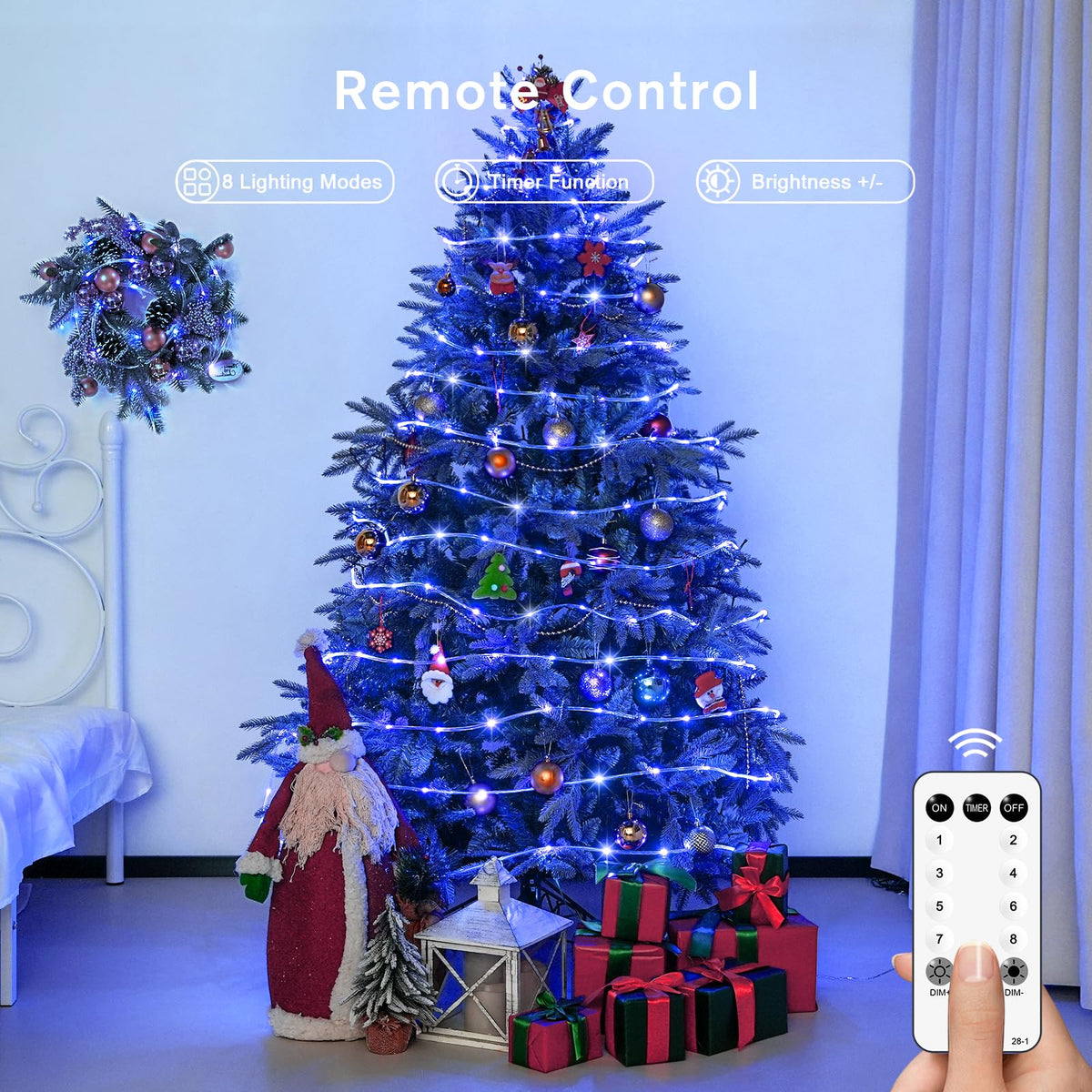 Q: What different lighting modes do these rope lights offer?A: These blue Christmas rope lights come with 8 different lighting modes that allow you to customize the ambiance. You can easily set the time and adjust brightness using the included remote control, making them versatile for any occasion.