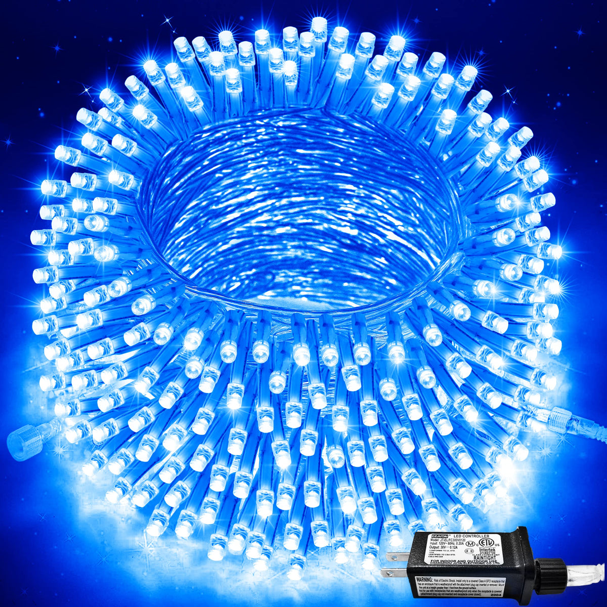 JMEXSUSS 250 LED String Lights, 91.5ft Blue Waterproof Christmas Lights, 8 Modes, Indoor/Outdoor, Model EXS-S-0250