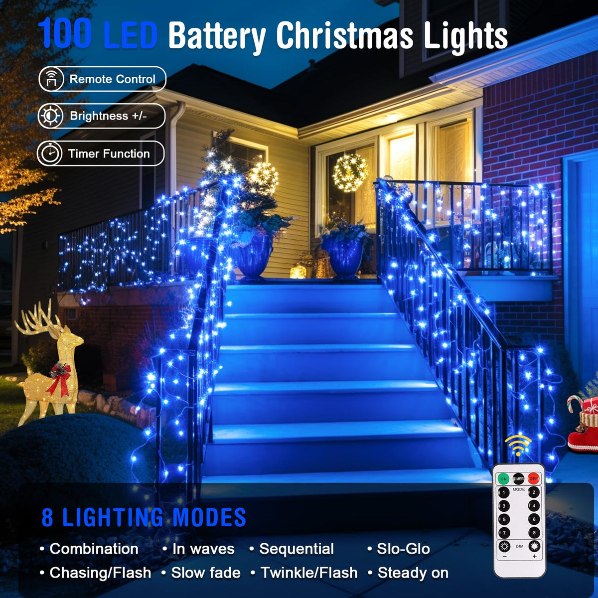Jmexsuss 33Ft 100 Led Blue Battery Operated Christmas Lights, Waterproof With 8 Modes For Indoor/Outdoor Decor