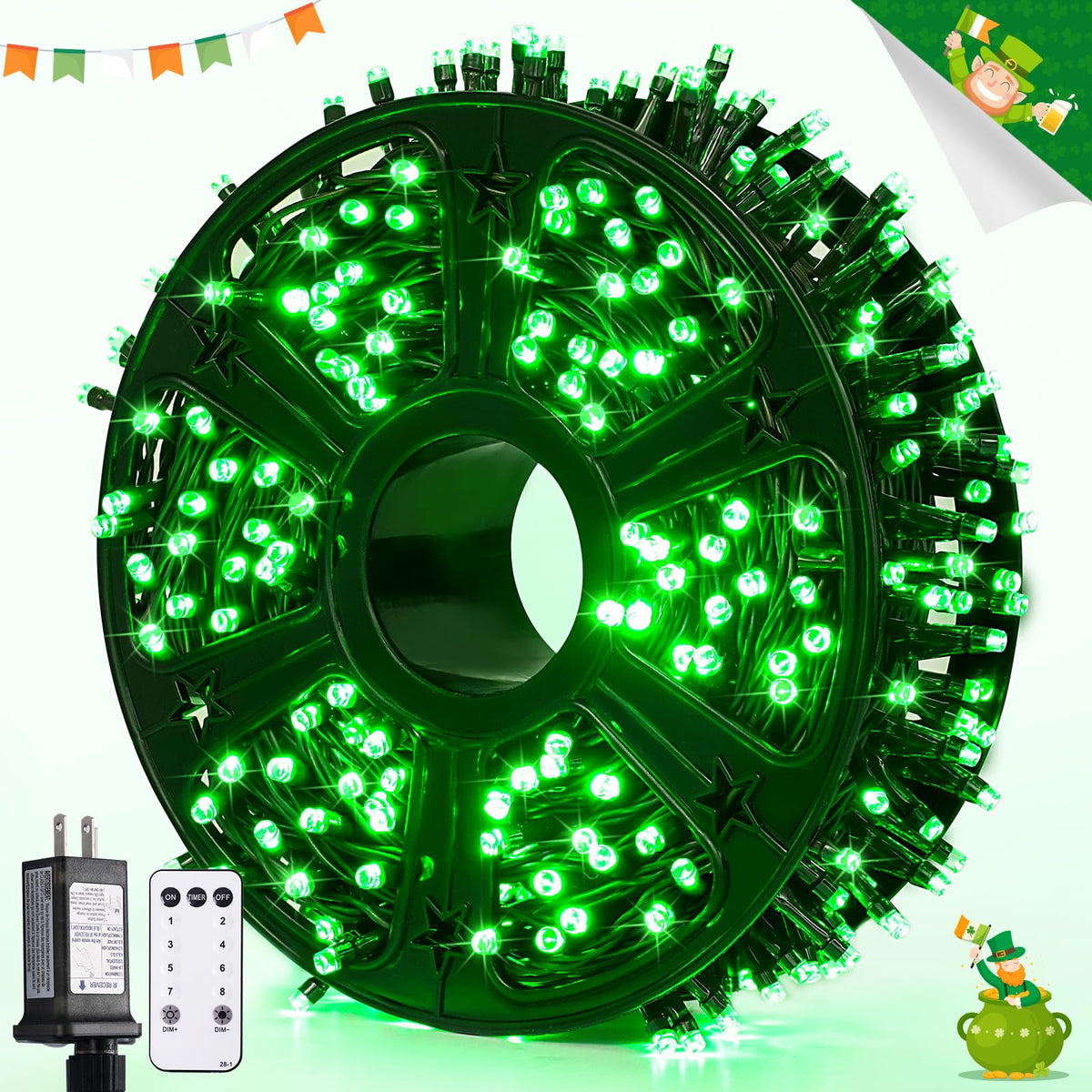 Q: What are the main features of the JMEXSUSS 400 LED Green St Patricks Day Lights?A: The JMEXSUSS 400 LED Green St Patricks Day Lights feature 400 bright green LEDs, 8 different lighting modes, a remote control for easy operation, and a unique storage wheel design for tangle-free storage. They are also waterproof and safe for outdoor use, ensuring durability during your celebrations.