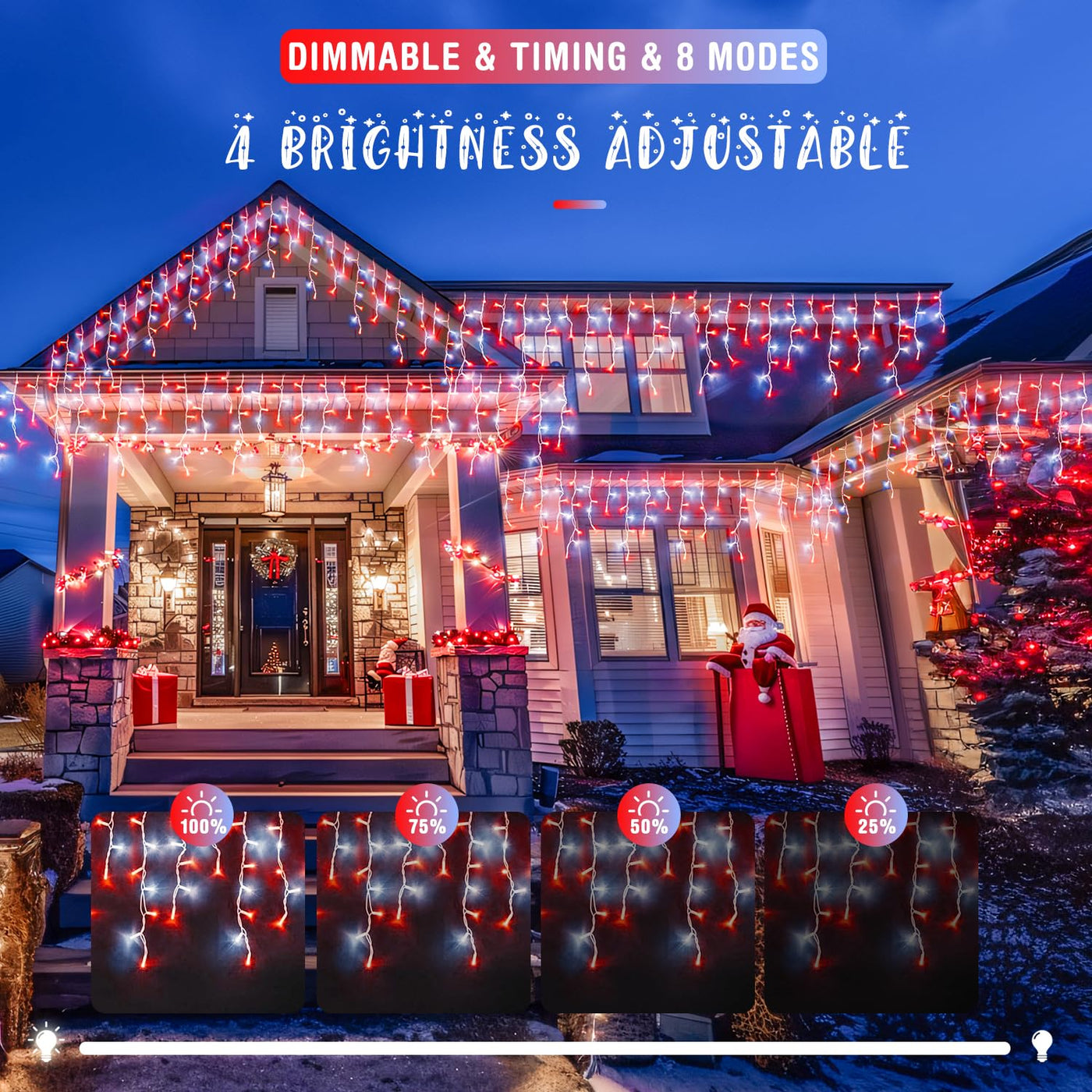 JMEXSUSS Icicle Christmas Lights, 400 LED, 38.8 Ft, 8 Modes, Red and White, Indoor/Outdoor, Model EXS-I-0400