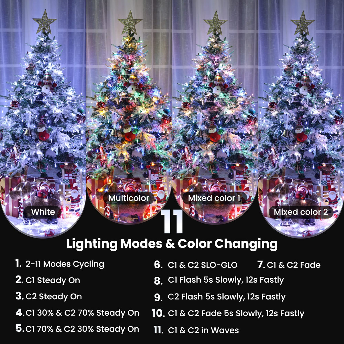 Constructed from durable polycarbonate, these lights are designed to withstand various weather conditions, ensuring long-lasting enjoyment. The string includes 164ft of lighted length plus a 9.8ft lead length, allowing for flexible and easy decoration of your home, tree, or outdoor spaces. With 11 different lighting modes, you can create the perfect ambiance for any occasion, whether its a cozy family gathering or an extravagant holiday party. The included remote control makes it easy to switch between modes, adjust brightness, and set timers.
