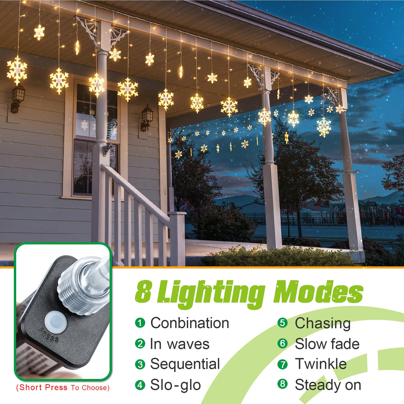 Q: What are the lighting modes available for the snowflake lights?A: The JOFIOS Snowflake Lights feature 8 different lighting modes: Combination, Wave, Sequence, Slo-glo, Chase/Twinkle, Slow Fade, Twinkle/Twinkle, and Steady Bright. You can easily switch between these modes by pressing the button on the adapter.