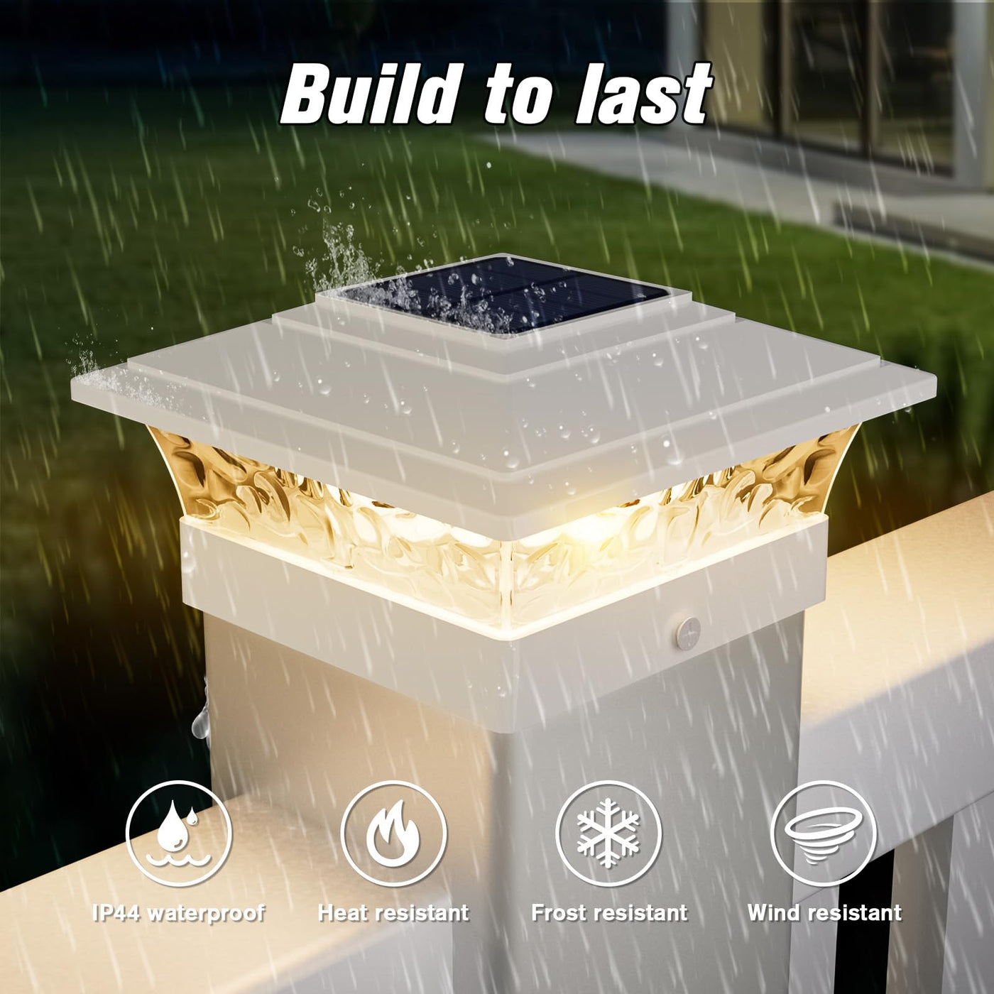 Q: Are these lights weather resistant?A: Yes, the Solar Post Cap Lights are made from IP44 waterproof material, ensuring they can withstand heavy rain, snow, and high temperatures, making them suitable for outdoor use in various weather conditions.