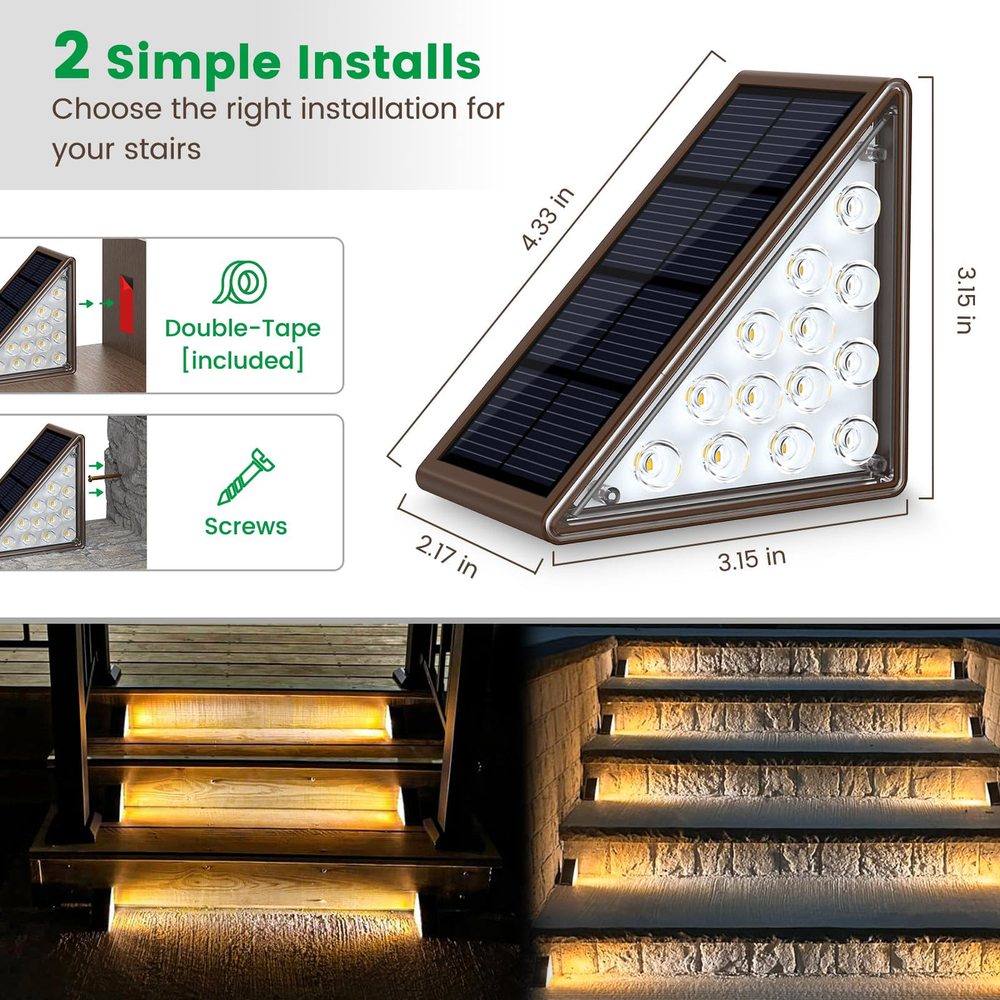 Jofios Solar Step Lights Can Decorate Your Outdoor Steps. The Advantage Of The Outdoor Step Light Is The Use Of Solar Energy And Can Automatically Switch Power And Automatic Charging, Small Step Light Equipped With Light Sensors, When The Night Falls, Your Deck Step Light Will Be Automatically Turn On.Jofios Solar Deck Lights Up Your Steps, The Bright Step Light Makes You No Longer Afraid Of The Dark, The Triangular Step Light Shape Is More Conducive To Let You Feel The Integration Of Technology And Reality, Enrich Your Outdoor Life.