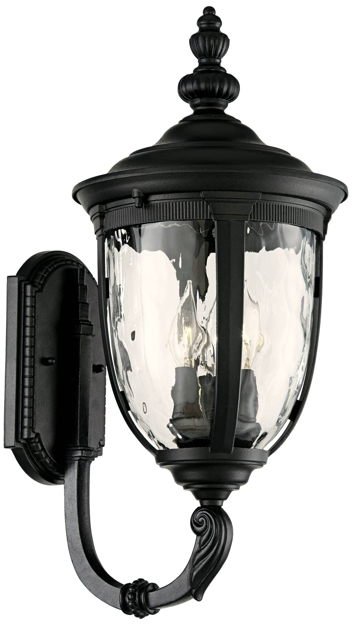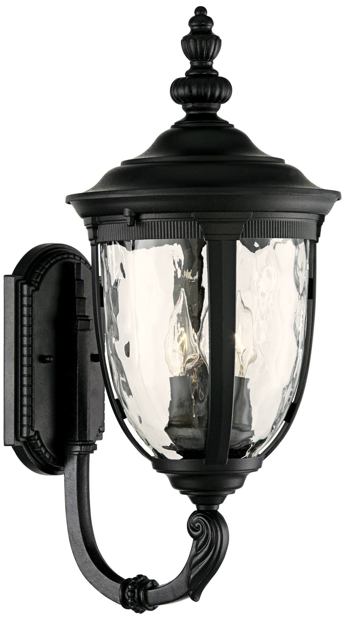 Inspired by traditional European lighting designs, this outdoor wall light is an exquisite addition to your porch or patio. With a texturized black finish and sturdy die-cast metal construction, it features clear hammered glass that imparts an elegant and refined look. The decorative scrolling upbridge arm enhances its aesthetic appeal, making it a standout piece in outdoor lighting.
