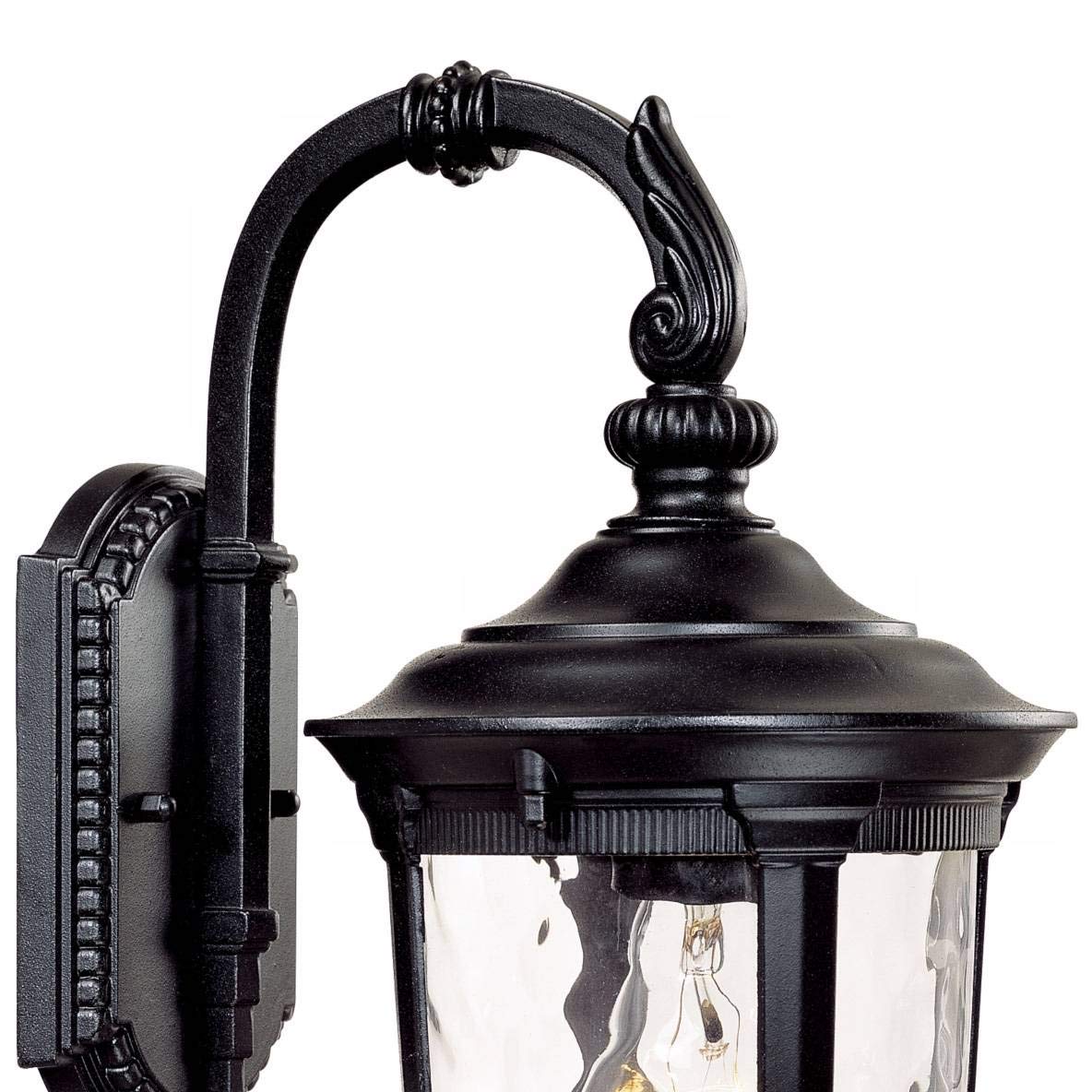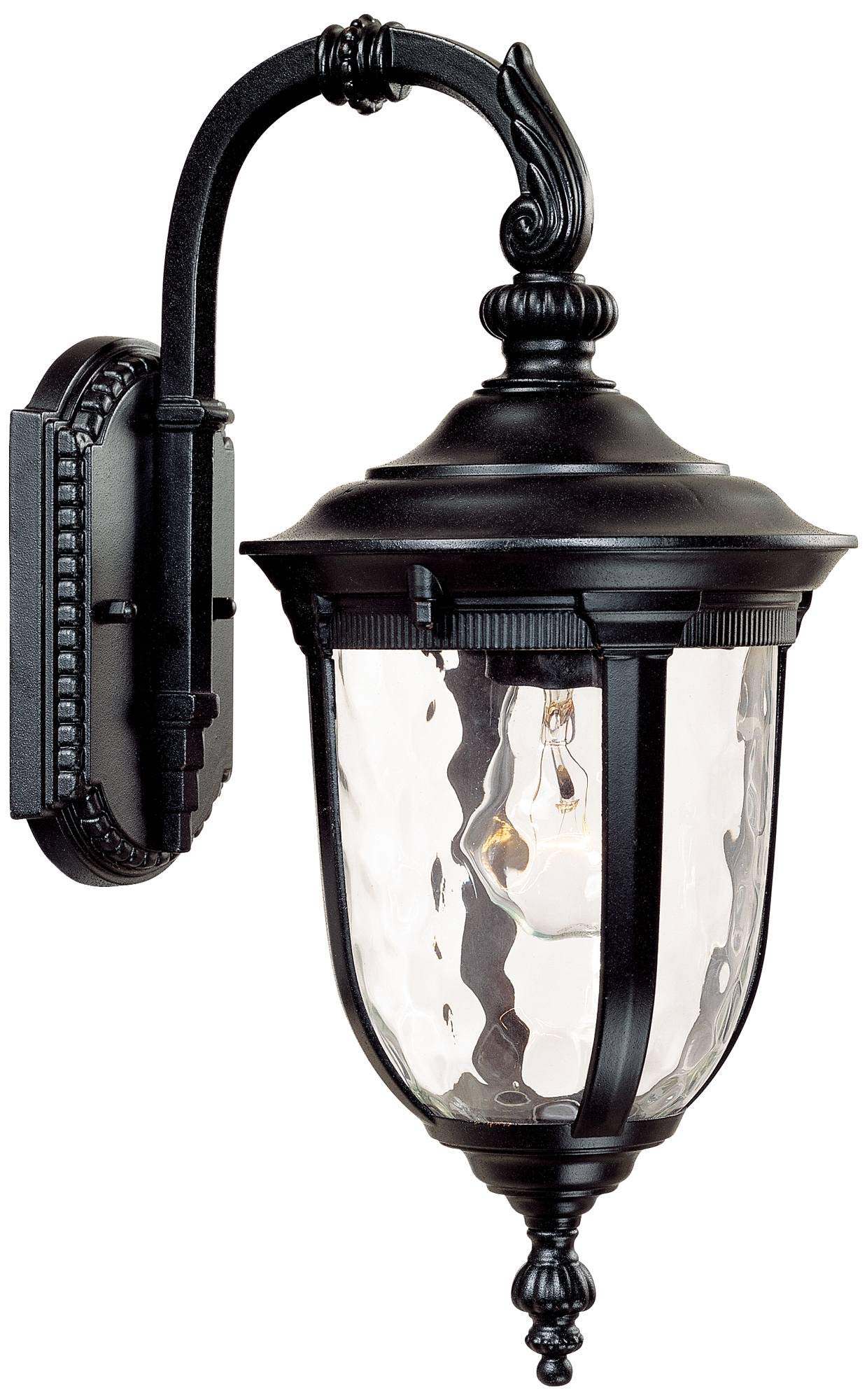 From the Bellagio outdoor lighting collection by John Timberland, this traditional design will add timeless appeal to any home. This outdoor wall light fixture features a handsome, antique-style backplate and downbridge top arm. The combination of clear hammered glass panels with a texturized black finish over sturdy die-cast aluminum construction creates a charmingly vintage look.