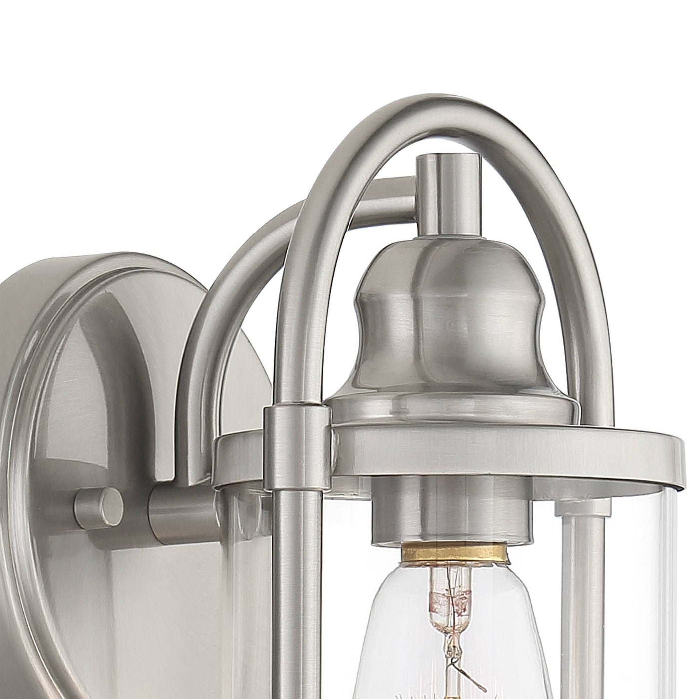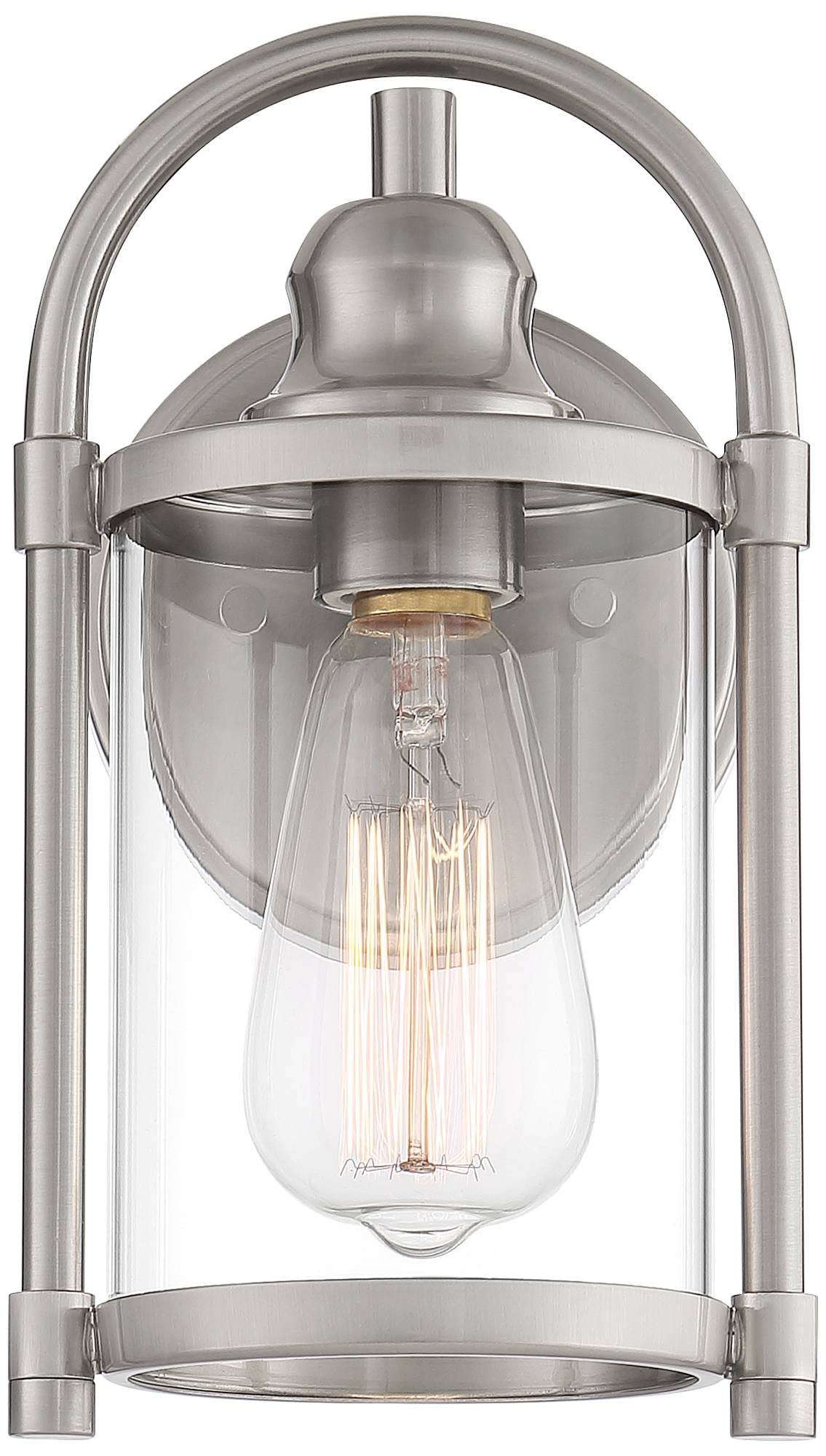 Q: What materials are used in the construction of these wall lights?A: The John Timberland Avani wall lights are constructed with a brushed nickel finish frame and top lantern arm, featuring clear glass for a stylish and durable design.