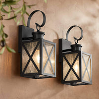 Introducing a stunning set of two outdoor wall lights that combine timeless elegance with modern functionality. Crafted by John Timberland, these lights are inspired by classic lantern designs and are perfect for enhancing the exterior of your home. With chic clear seedy glass and a textured black finish, they are not just light fixtures; they are a statement of style and sophistication.