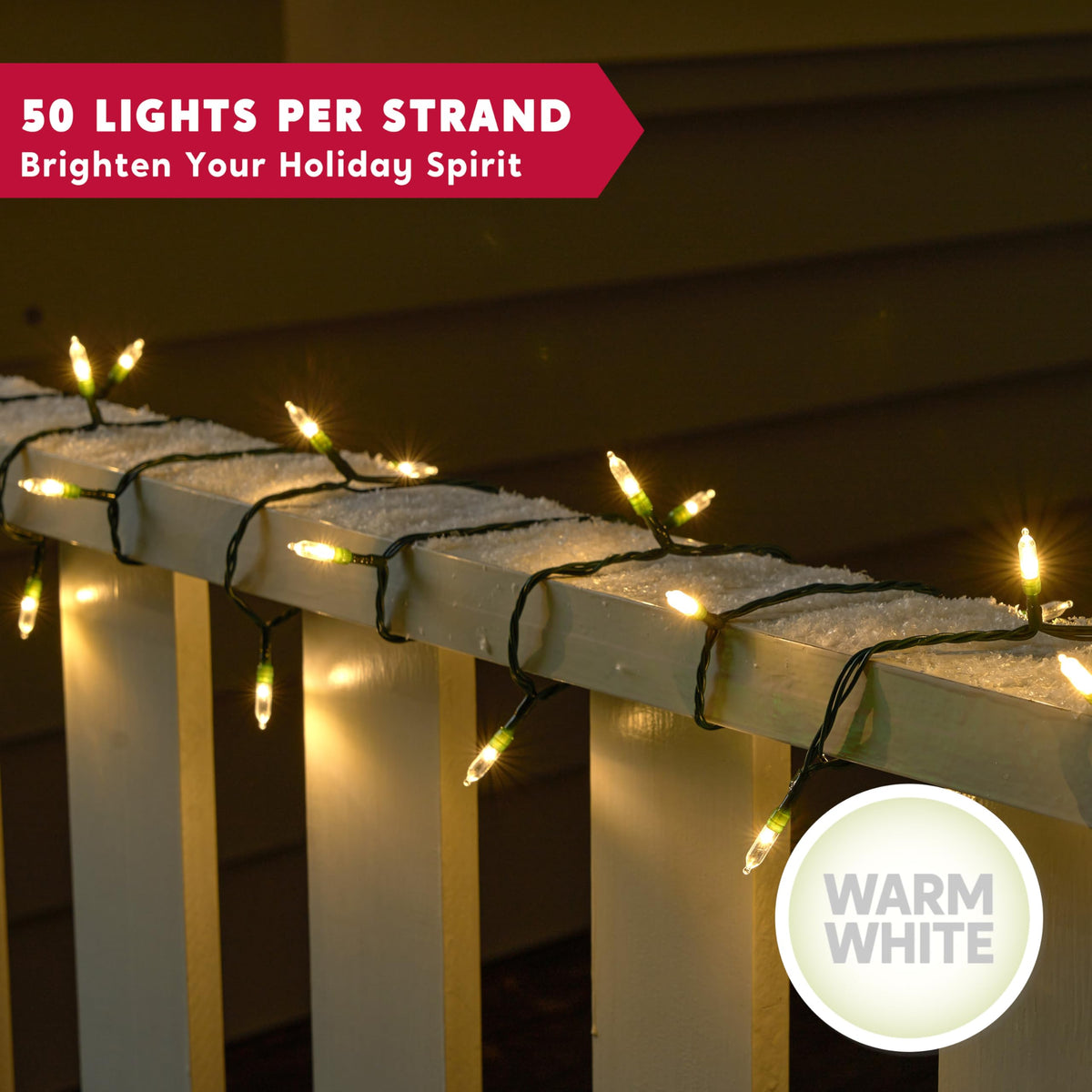 17.3ft Christmas Clear White 50 LED Green Wire String Lights, Battery Powered with 8 Modes 6 Hr Timer for Indoor and Outdoor Party, Home, Patio, Lawn, and Garden Holiday DecorationSUPER VALUE. This battery powered Christmas string light has 50 counts of warm white LED bulbs and measures at 17.3ft. Each set has 17.3 feet wire length and 16.3 ft lighted length. The bulbs interval is at 4 inches and its individual size is 3mm*16mm.EASY TO OPERATE. The string lights could change the lighting modes (Combination, In waves, Sequential, Slow Glow, Chasing/Flash, Slow fade, Twinkle/Flash, Steady on) by hitting the button in the battery box.IDEAL HOLIDAY LIGHTS. Our battery powered lights are flexible making it ideal to hang anywhere and to anything like trees, wreaths, patios, hedges, fences, pillars, weddings, holidays, home, festival decor lights, and more. Perfect also for Christmas, Thanksgiving, and many more holidays.PREMIUM QUALITY. Made of durable and high-quality materials to withstand any types of weather. This is UL certified which is safe to use.CUSTOMER SATISFACTION. Providing a great shopping experience is our main priority to our customers. Feel free to message us through contact sellers'' if products don't meet your expectations.