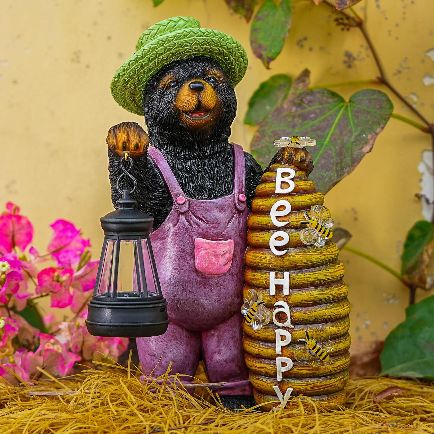 Joint Honglin Solar Adorable Bear Garden Statue with Beehive and Lantern - Bee Happy Resin Outdoor Decoration for Yard, Patio