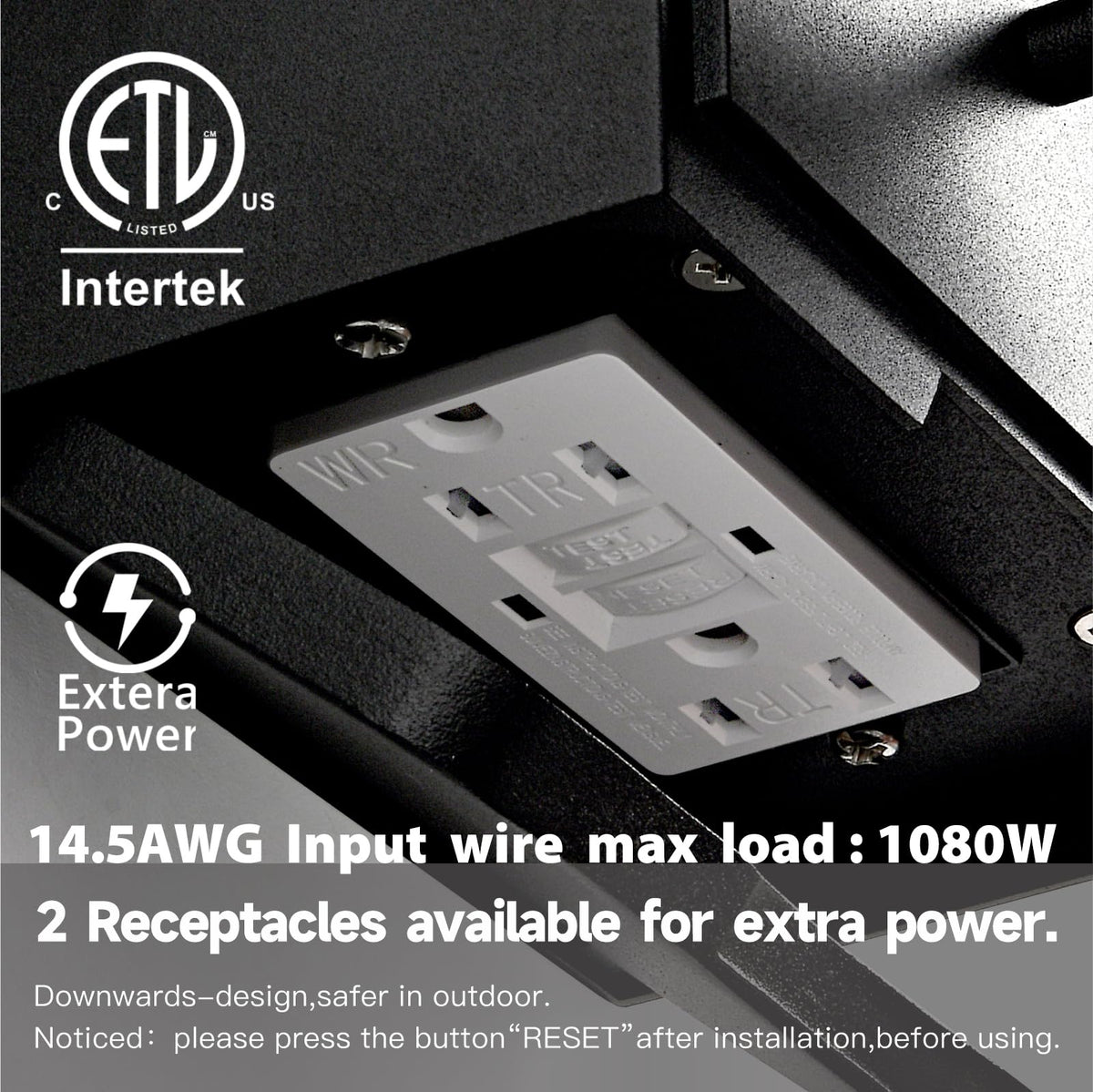 This outdoor porch light has built-in 2 GFCI outlets for bi-plug and tri-prong plugs, which is convenient for accessing your outdoor equipment, and the downward-facing design effectively protects the outlet from the rain. Besides, our exterior lights for house with motion sensor offer you 3 lighting modes to meet your various lighting needs.The outdoor light with outlet is made of sturdy metal frame and tempered glass,waterproof and corrosion-resistant, which can easily withstand severe weather conditions such as rainstorms, blizzards, and low temperatures.This porch light fixture is compatible with a variety of E26 bulbs, and we will provide a sensor bulb to you.The size of our black exterior light fixtures is 10.3 L x 10W x 12.5 H and the size of the wall plate is 4.8 L x 3.0W x 5.7 H. And you can install these exterior garage lights easily with all necessary mounting accessories. It is really a sensible choice for you to choose our product!