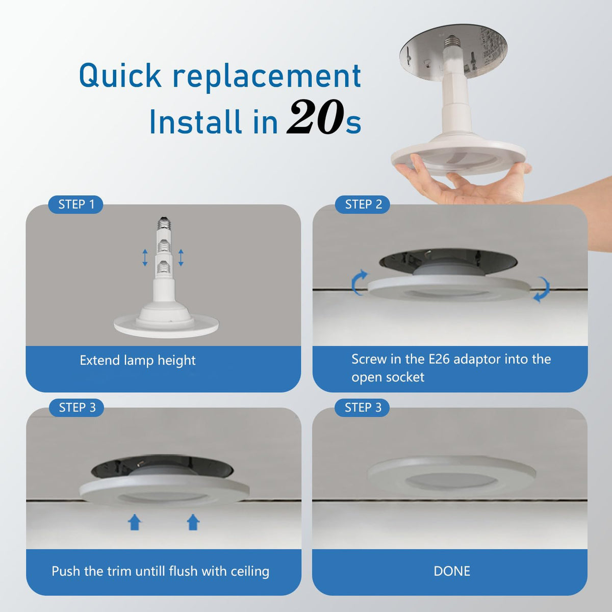 Q: How do I install the Jolux 5/6 Inch Adjustable Height LED Can Lights?A: Installation is simple and quick. Just screw in the E26 adaptor into the existing socket and push the light up to fit snugly against the ceiling. It takes approximately 15 seconds to install each light.