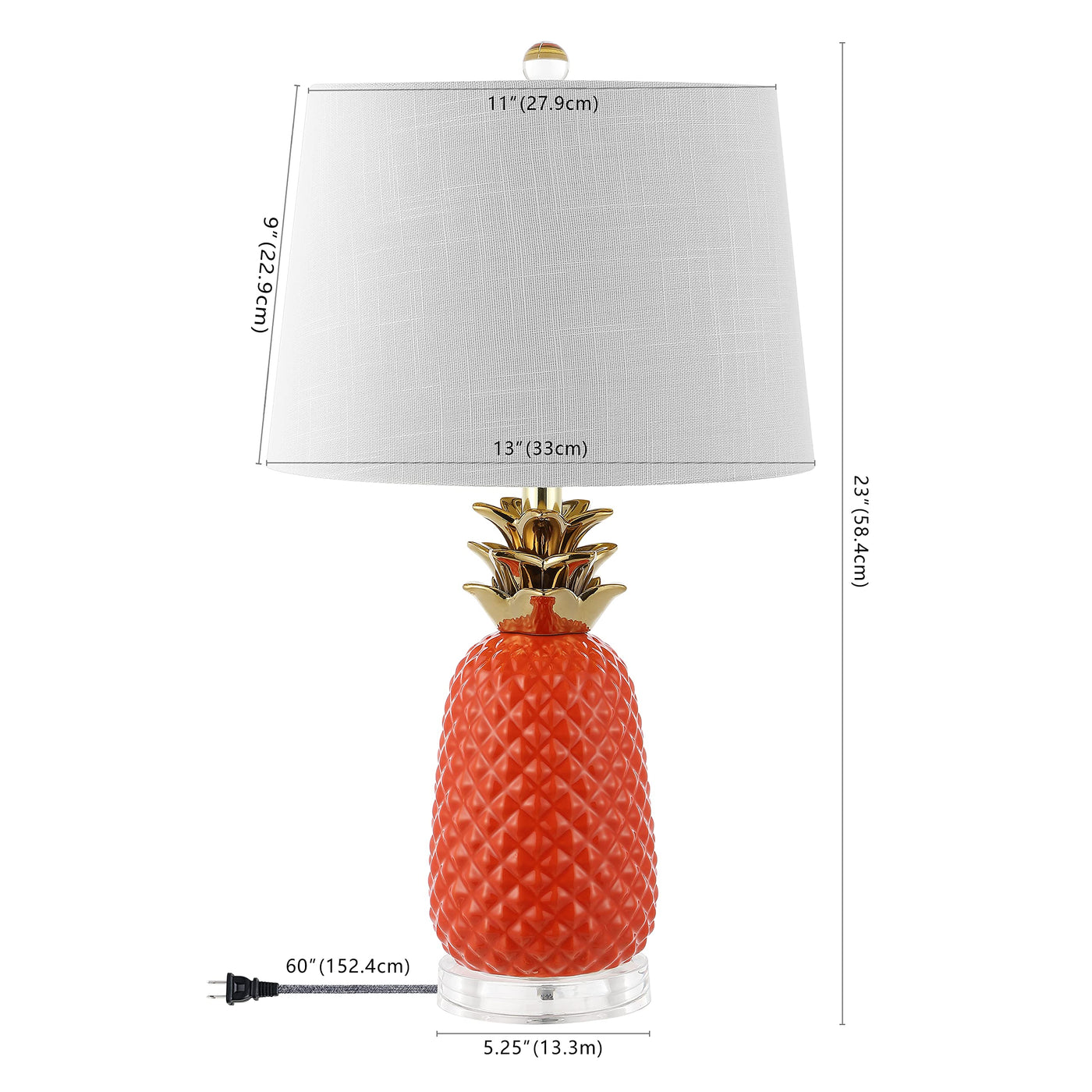 Q: What are the dimensions of the JONATHAN Y Pineapple Table Lamp?A: The lamp stands at 23 inches tall, with a base length and width of 13 inches each, making it a perfect fit for bedside tables, desks, or living room decor.