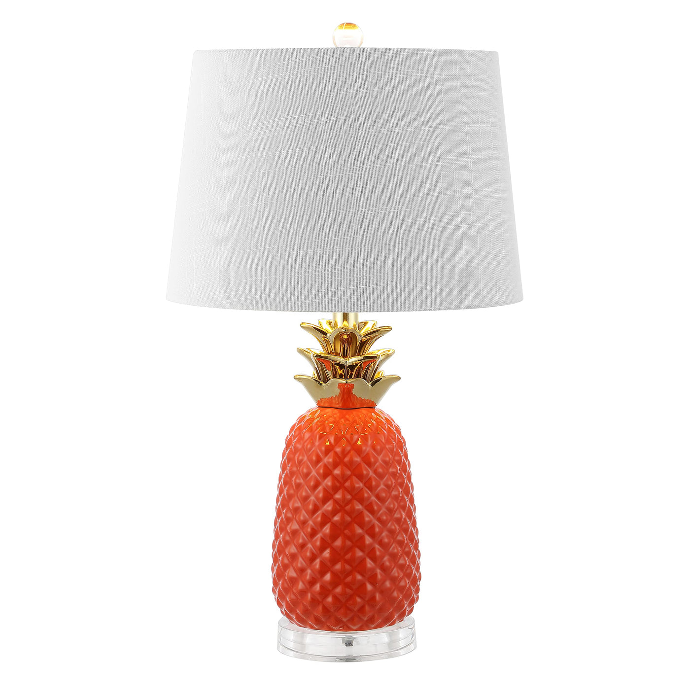 Q: How should I care for the ceramic and acrylic materials of the lamp?A: To maintain the JONATHAN Y Pineapple Table Lamp, simply wipe the ceramic and acrylic surfaces with a soft, damp cloth to remove dust and avoid using harsh chemicals that could damage the finish.