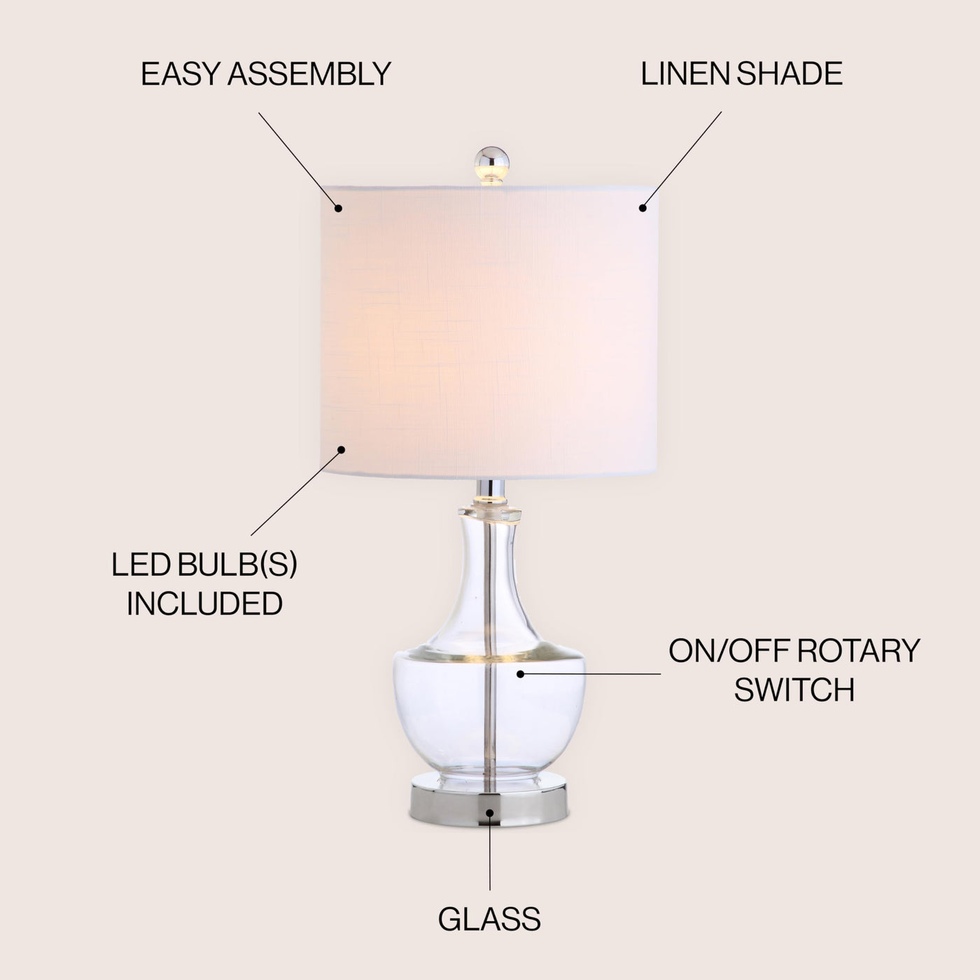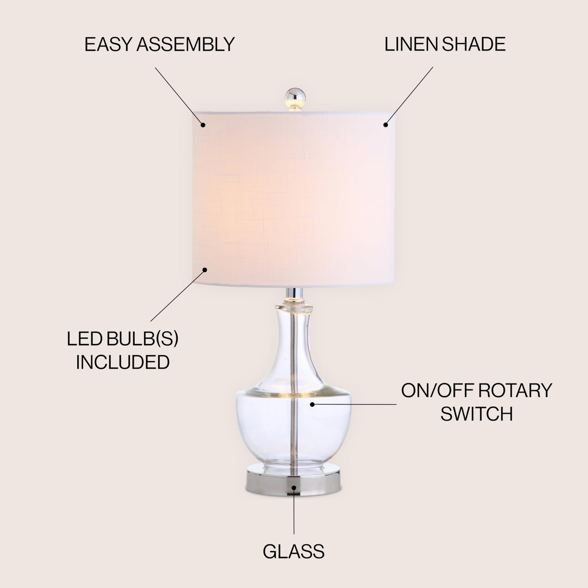 Q: How do I clean and maintain the glass lamp?A: To clean the JONATHAN Y Colette Mini Glass LED Table Lamp, simply use a soft, damp cloth to wipe the glass surface. Avoid using harsh chemicals or abrasive materials to maintain its elegant appearance.