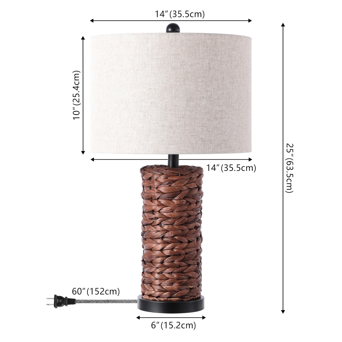 Prized for its beautiful dark brown finish and hand-braided craftsmanship, this pair of table lamps is a stunning addition to any coastal-inspired decor. The cylinder bases are meticulously wrapped in dried water hyacinth, a material often used in basketry, which not only adds a casual charm but also enhances the texture of your living space. Completed with a matching finial and a natural linen beige shade, these lamps effortlessly embody an instant coastal classic, making them a perfect choice for both functionality and aesthetic appeal.