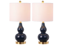 The Smaller Scale Of This Classic Double-Gourd Table Lamp Makes It The Perfect Fashionable And Functional Accent For A Console Table Or Nightstand. The Hand-Blown Glass Body Stuns In A Gorgeous Shade Of Navy, Finished With A Brass-Plated Base Pedestal And Matching Accents. Up Top Is A White Linen Fabric Shade And Brass-Colored Sphere Finial. A Classic Glass Lamp With A Modern Shape, This Piece Will Add Both Light And Style To A Variety Of Rooms. This Item Is Sold As A Set Of Two.