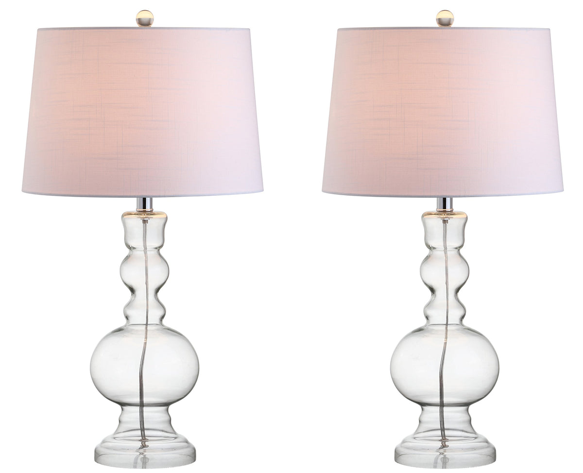 Q: What type of decor styles do these table lamps complement?A: The contemporary and transitional design of the JONATHAN Y table lamps, featuring a clear blown glass base and crisp white shades, makes them versatile enough to suit various home decor styles, from modern to traditional.