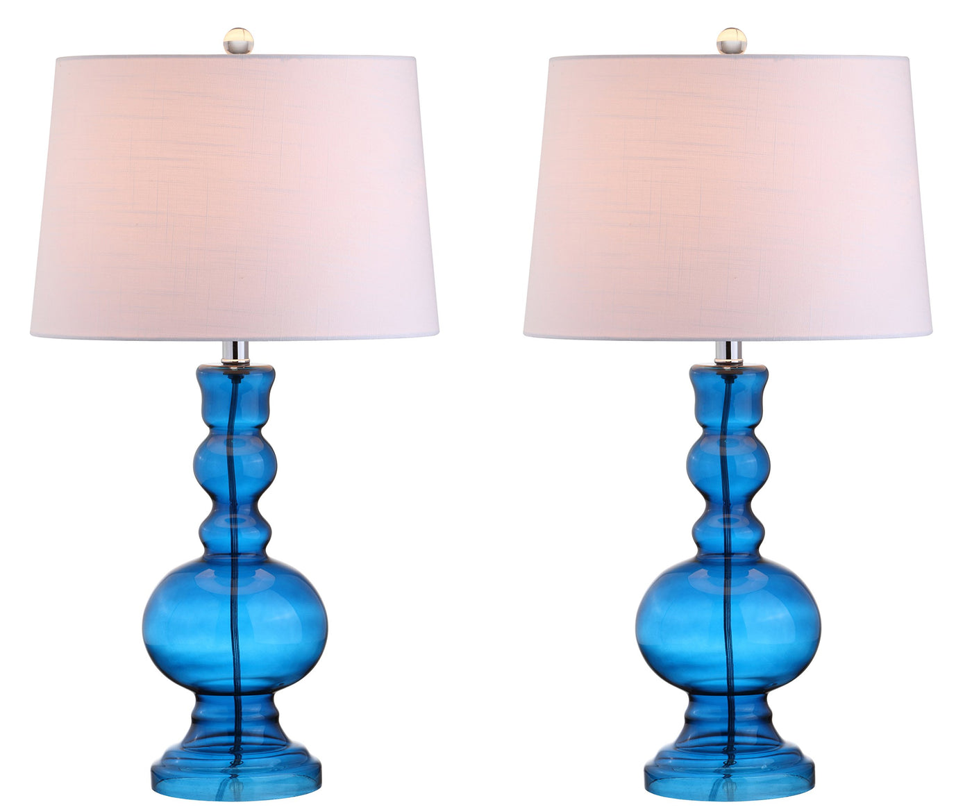 Bookend A Shelf Or Console With An Eye-Catching Pair Of These Beautiful Blown-Glass Table Lamps. The Vibrantly Hued Glass Bodies Are Gently Curved, And The Crisp White Shades Finish These Lamps In Classic Style. A Statement-Making Night Blue Hue Makes This Set Of Two The Perfect Pair For Infusing Color Into Your Home Decor.