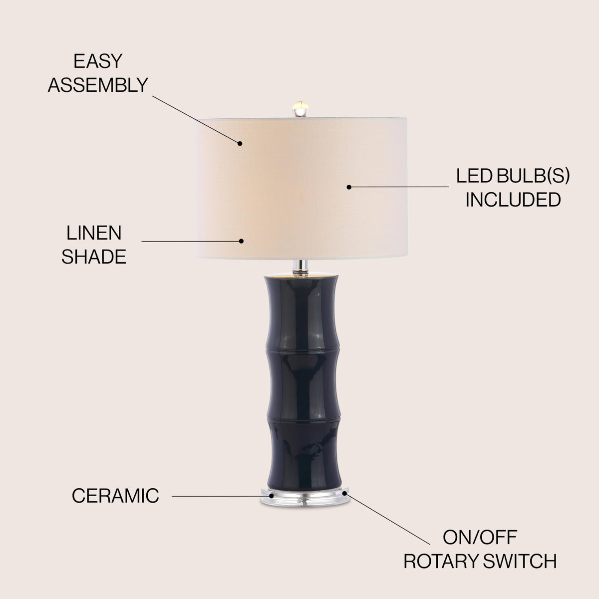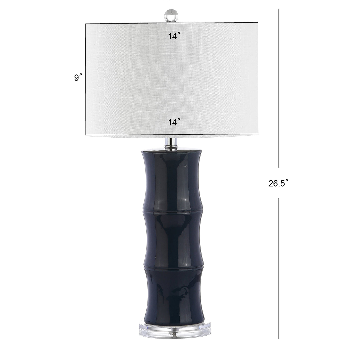 This eye-catching navy ceramic table lamp takes its inspiration from the beauty of natural bamboo. The resulting look is a perfect balance between Asian and modern styles, with a preppy flair. Nickel accents, a crystal base and a white cotton drum shade keep the look contemporary and fresh.