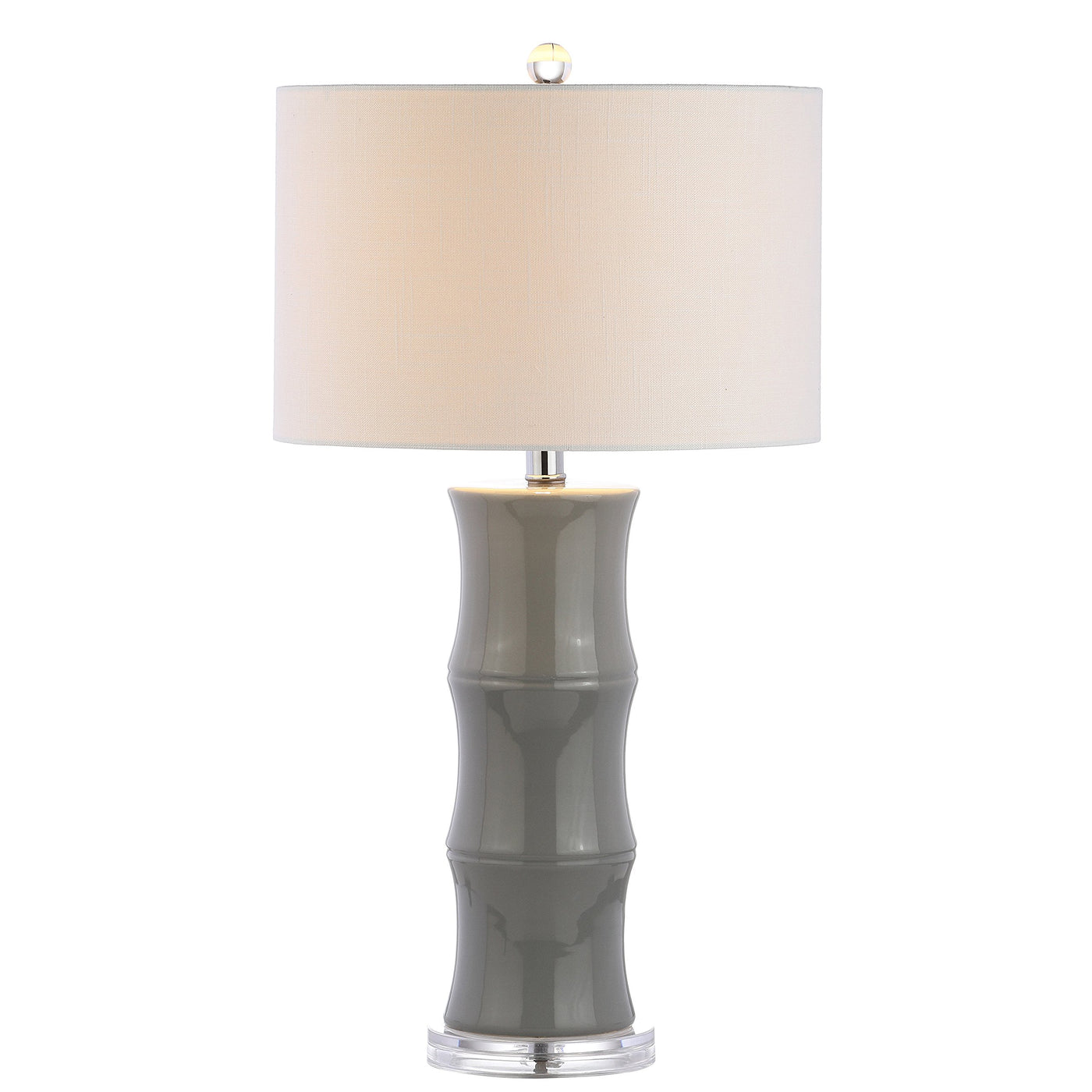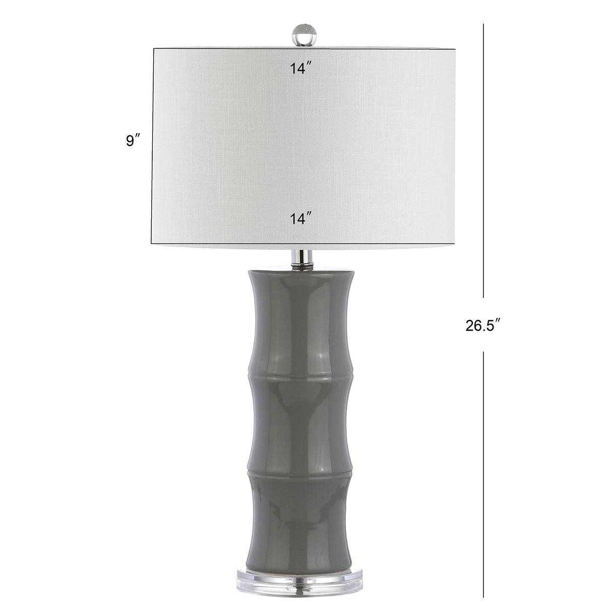 This eye-catching Gray ceramic table lamp takes its inspiration from the beauty of natural bamboo. The resulting look is a perfect balance between Asian and modern styles, with a preppy flair. Nickel accents, a crystal base and a white cotton drum shade keep the look contemporary and fresh.