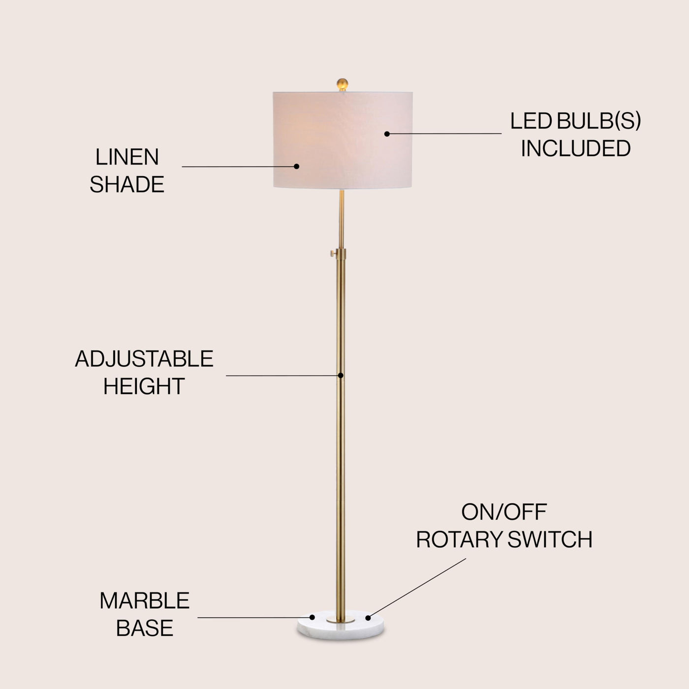 Jonathan Y Jyl3022A June 65'' Adjustable Metal/Marble Led Floor Lamp, Modern, Contemporary, Elegant, Glam, Office, Living Room,