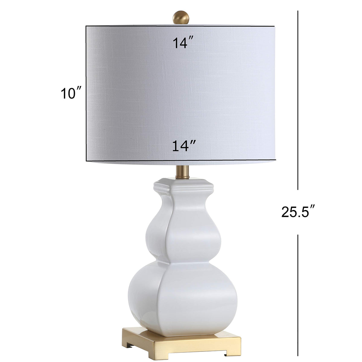 Q: What are the dimensions of the JONATHAN Y JYL3049B table lamp?A: The JONATHAN Y JYL3049B table lamp measures 25.5 inches in height, with a base length and width of 14.02 inches, making it a perfect size for bedside tables and desks.