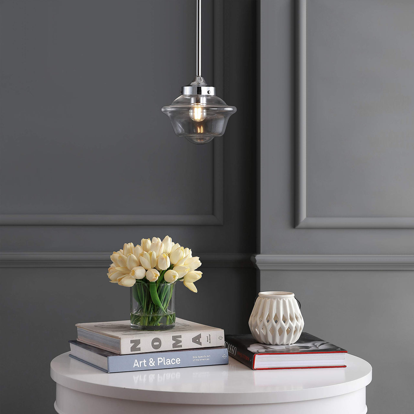 Though originally used in pharmacies because of their simple upkeep -- the glass is simple to dust, bulbs easily changed from removing the shade from below -- this pendant's silhouette is perhaps most famously known by students of the 1950s as ''the schoolhouse pendant'' thanks to a large government order that made this the official light of chemistry labs until the mid-70s when fluorescents were installed (forgive them! ). We took inspiration from the original -- gracious curves, simple upkeep, and adjustable drop -- because if there is one thing we have learned, it's that great design never goes out of style.