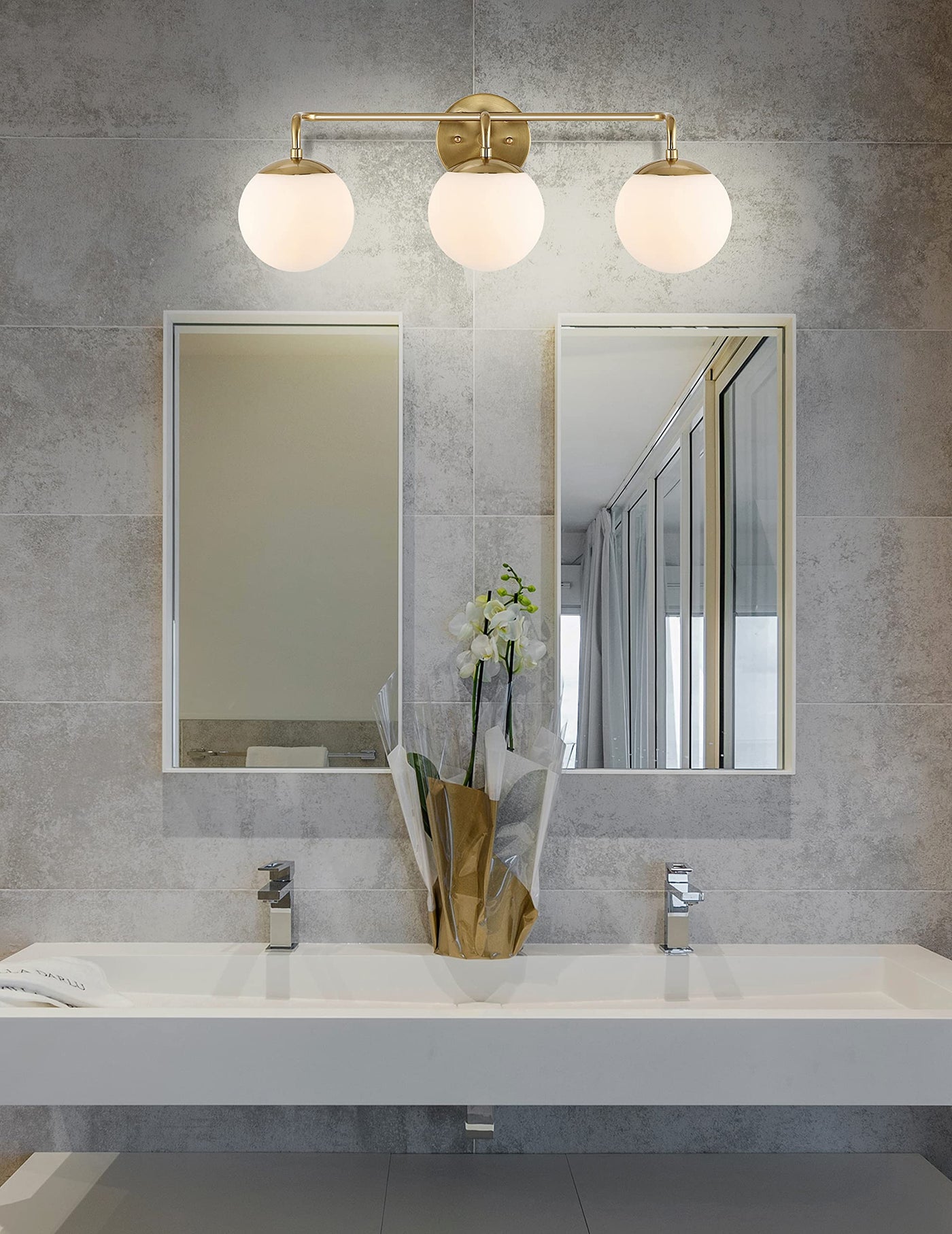 Bring on the vintage Parisian flair with our classic bistro wall light. Three frosted glasses globe provide plenty of light. Clean lines and a brass finish add modern French bistro style to your bath vanity, kitchen, hallway or entry.
