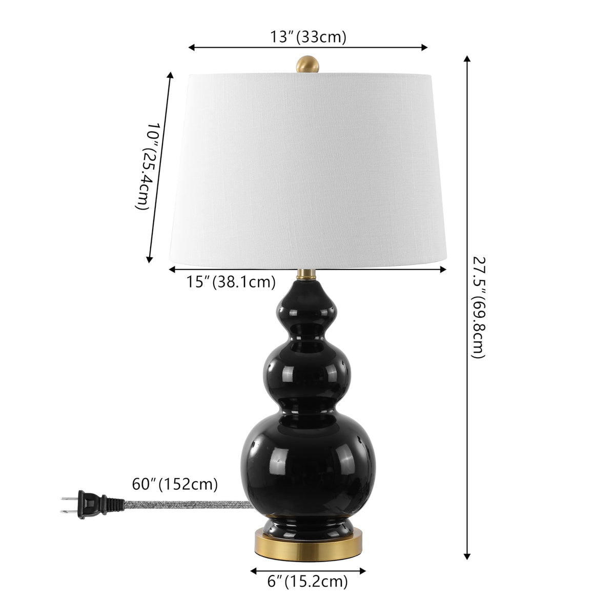 Q: What materials is the lamp made of?A: The lamp features a triple-gourd ceramic base finished in black, a 100% linen hardback drum shade, and a crystal pedestal, combining elegance with contemporary design.