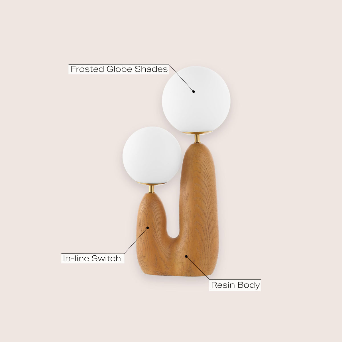 The wood-look design of this minimalist lamp has a mid-century modern Danish vibe. Inspired by Nordic style, this 2-light lamp is a chic addition to any living room, bedroom, or office. Frosted globes soften the bright LED bulbs to provide soft ambient light.