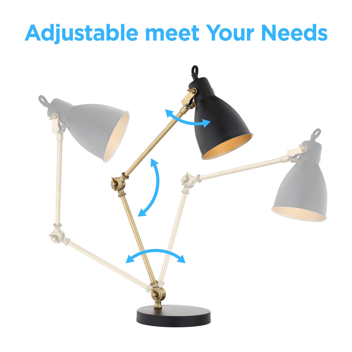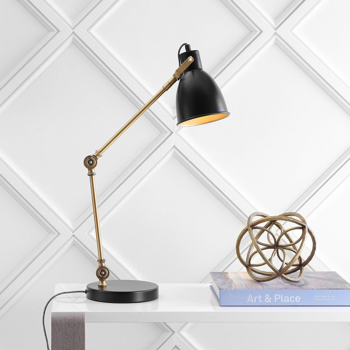 Sleek style and a slender profile add allure to the design of this desk lamp in black and gold. A fresh, polished color combination transforms a classic silhouette into something enticing, combining an iconic shape with luxe finishing touches including brass plating, LED compatibility, and a silk-wrapped cord. This black and antique brass metal desk lamp is right at home in an upscale business or residential work space.
