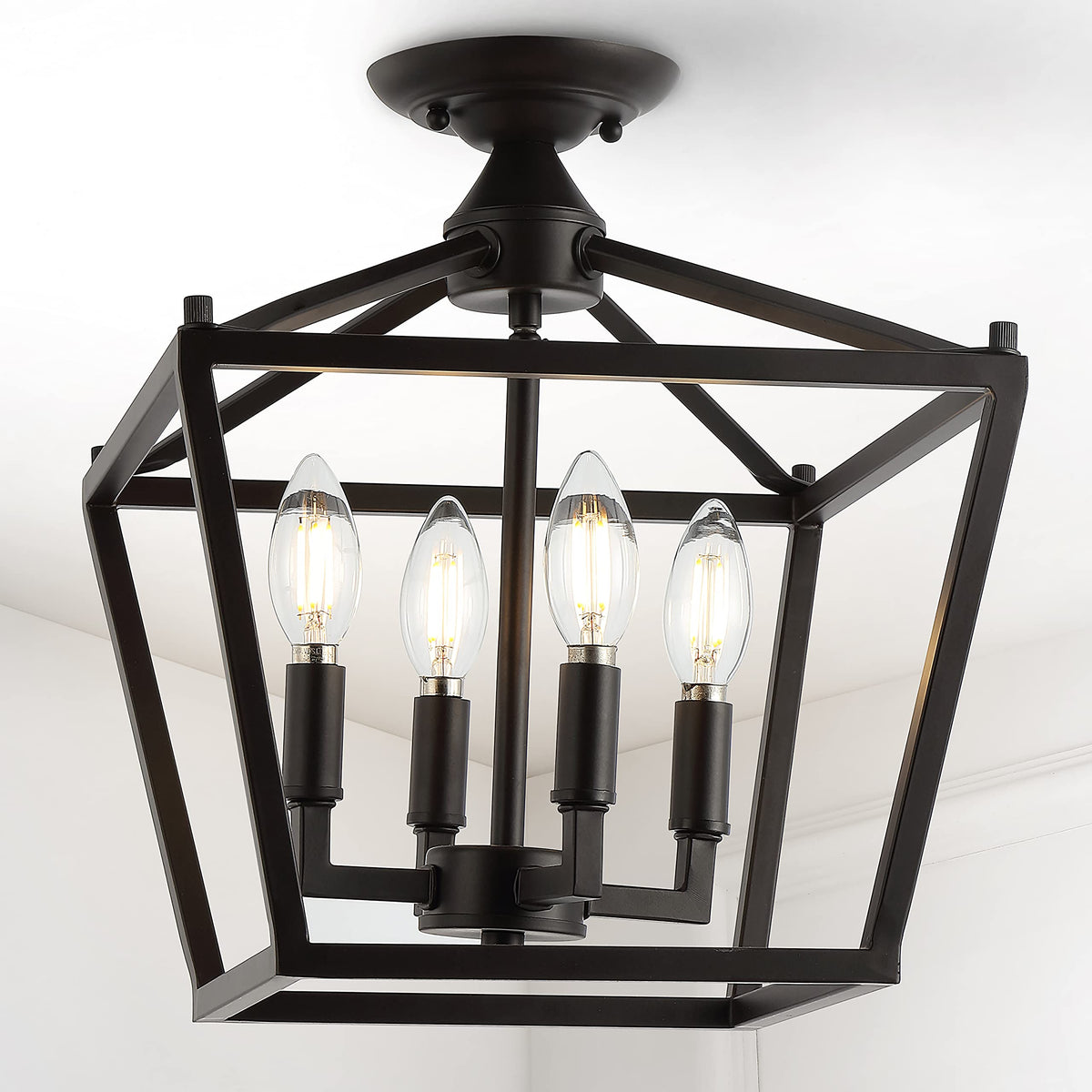 This ceiling light features a robust construction with an oil-rubbed bronze finish and is crafted from well-made iron. The elegant lantern shape houses four LED candelabra bulbs, offering a warm and inviting glow while ensuring energy efficiency. The compact size of 12 inches makes it ideal for smaller spaces, providing ample lighting without overwhelming the room.