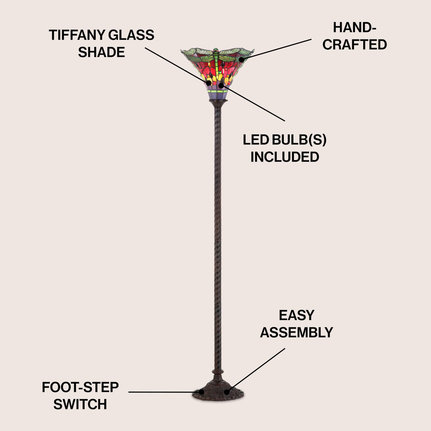 One Of The Finest Techniques To Come Out Of The Art Nouveau Movement, The Tiffany-Style Stained Glass Shade On This Torchiere Floor Lamp Makes For A Stunning Addition To Any Space. While Steeped In Traditional Design With It'S Barley-Twist Base And Dragonfly Motif On The Shade, This Piece Is Updated With The Functionality Expected Today -- A Step-On On/Off Button, Led Bulb Compatibility, And A Beautiful Silk-Wrapped Cord. Each Shade Is Hand-Made By Artisans Who Specialize In The Intricate Art Of Stained Glass Soldering.