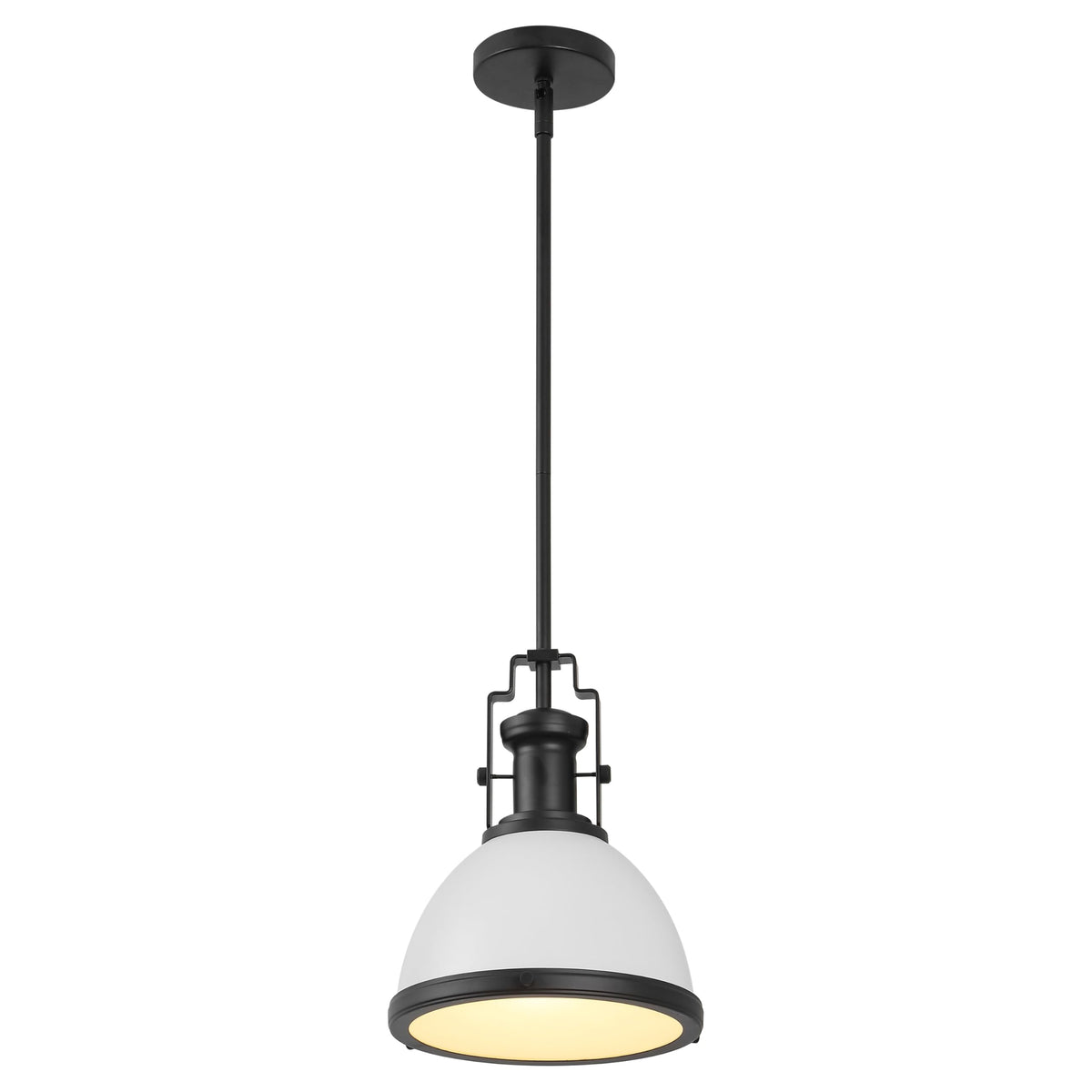 With its vintage detailing and classic good looks, this large kitchen pendant light adds an upscale touch to any traditional interior. The matte black finish is combined with a white metal hood for a crisp style contrast. The single LED bulb provides plenty of bright light, softened by a diffuser panel.