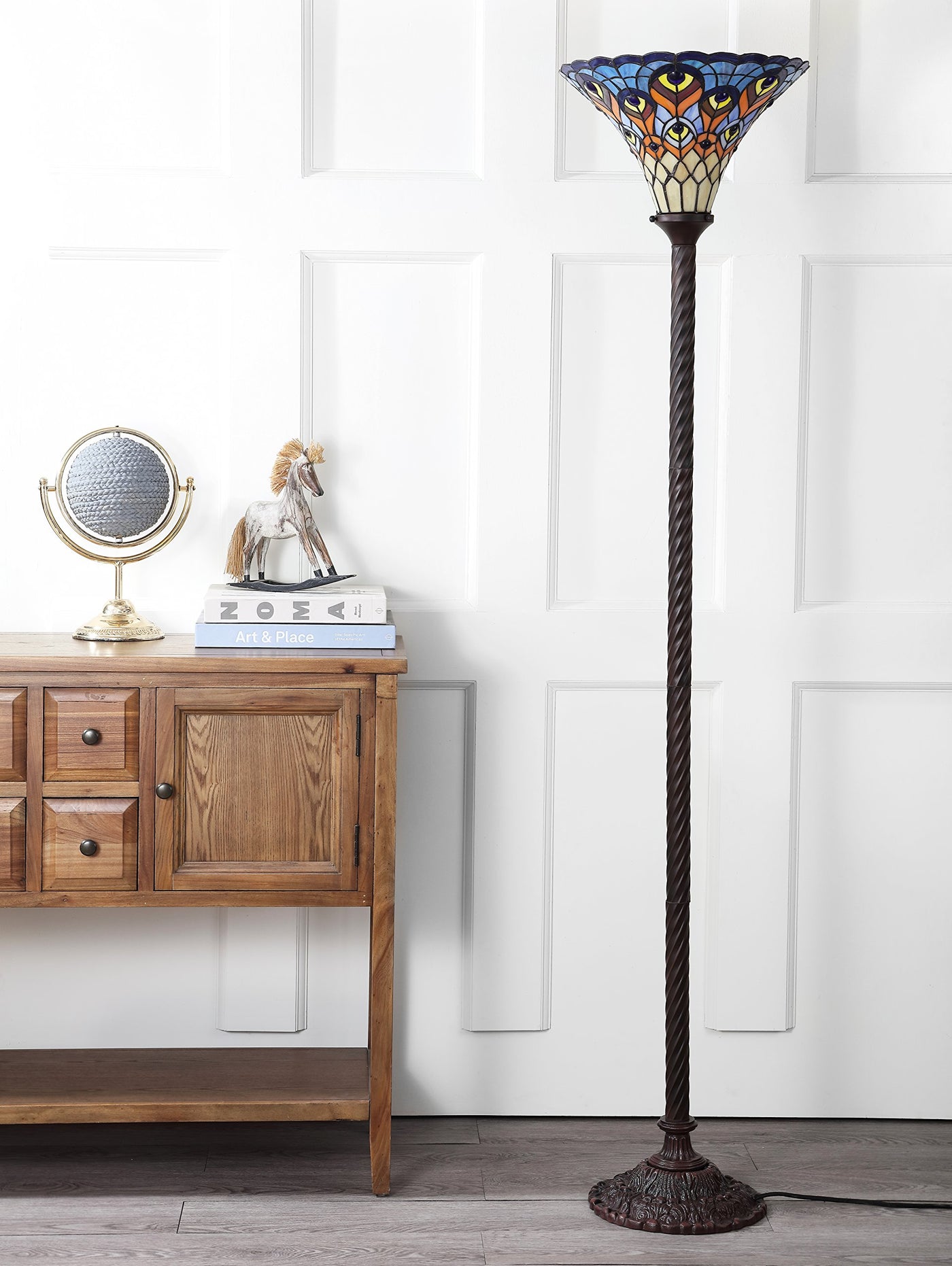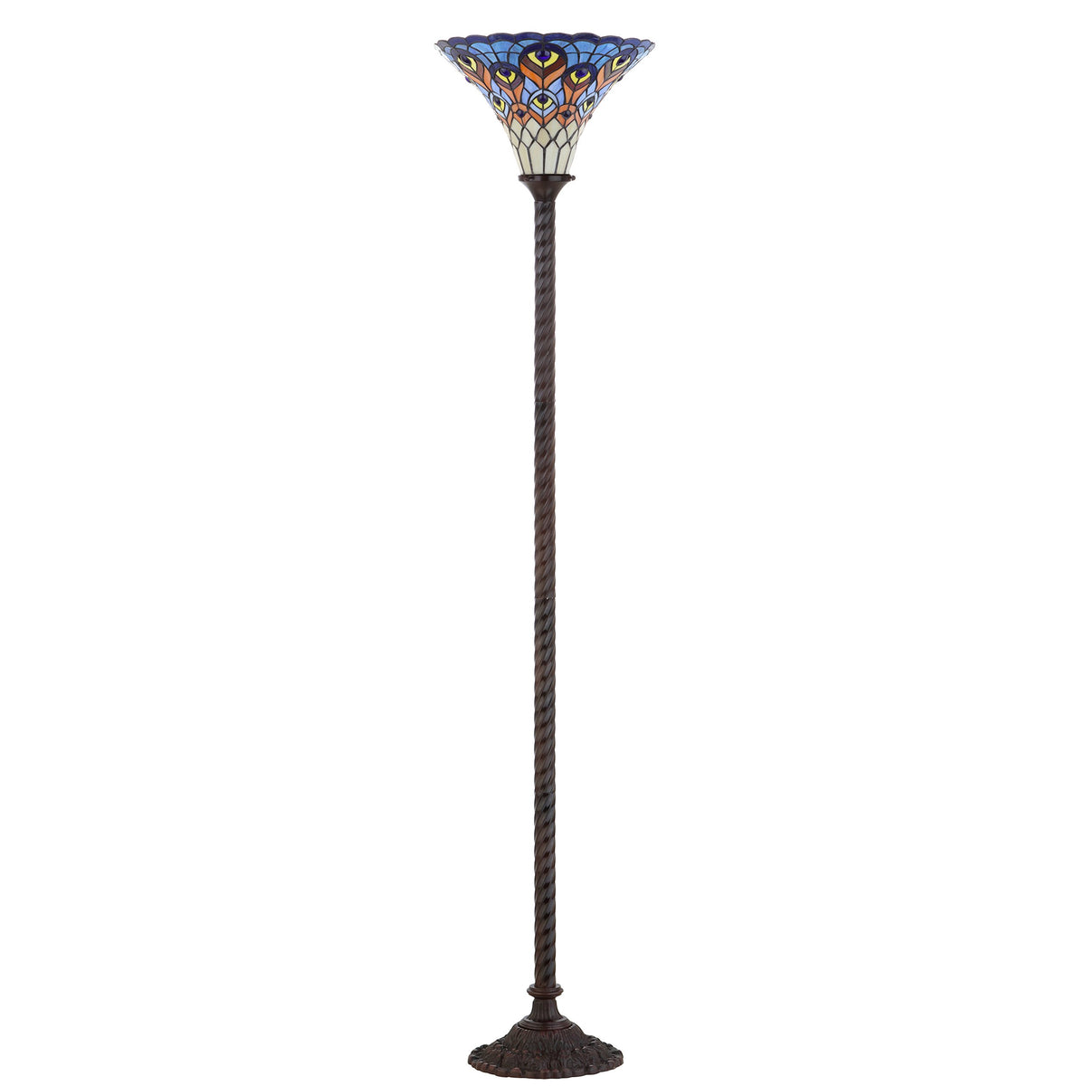 Transform your living space with the exquisite JONATHAN Y JYL8006A Torchiere Floor Lamp. Inspired by the timeless art Nouveau movement, this lamp features a stunning Tiffany-style stained glass shade that adds a touch of elegance and sophistication to any room. The intricate design showcases a beautiful peacock feather motif, making it a striking focal point in your home decor. Combining traditional craftsmanship with modern functionality, this lamp is the perfect blend of aesthetics and practicality.