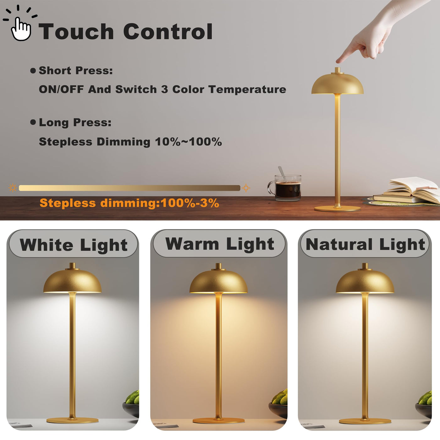 Jonemo Rechargeable Cordless Table Lamp - 5000Mah Battery Operated Table Light, 3 Color Stepless Dimmable Led Table Lamp With Me