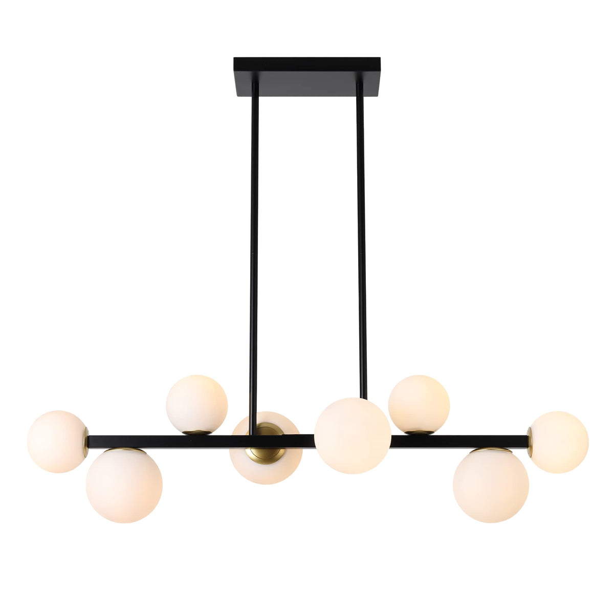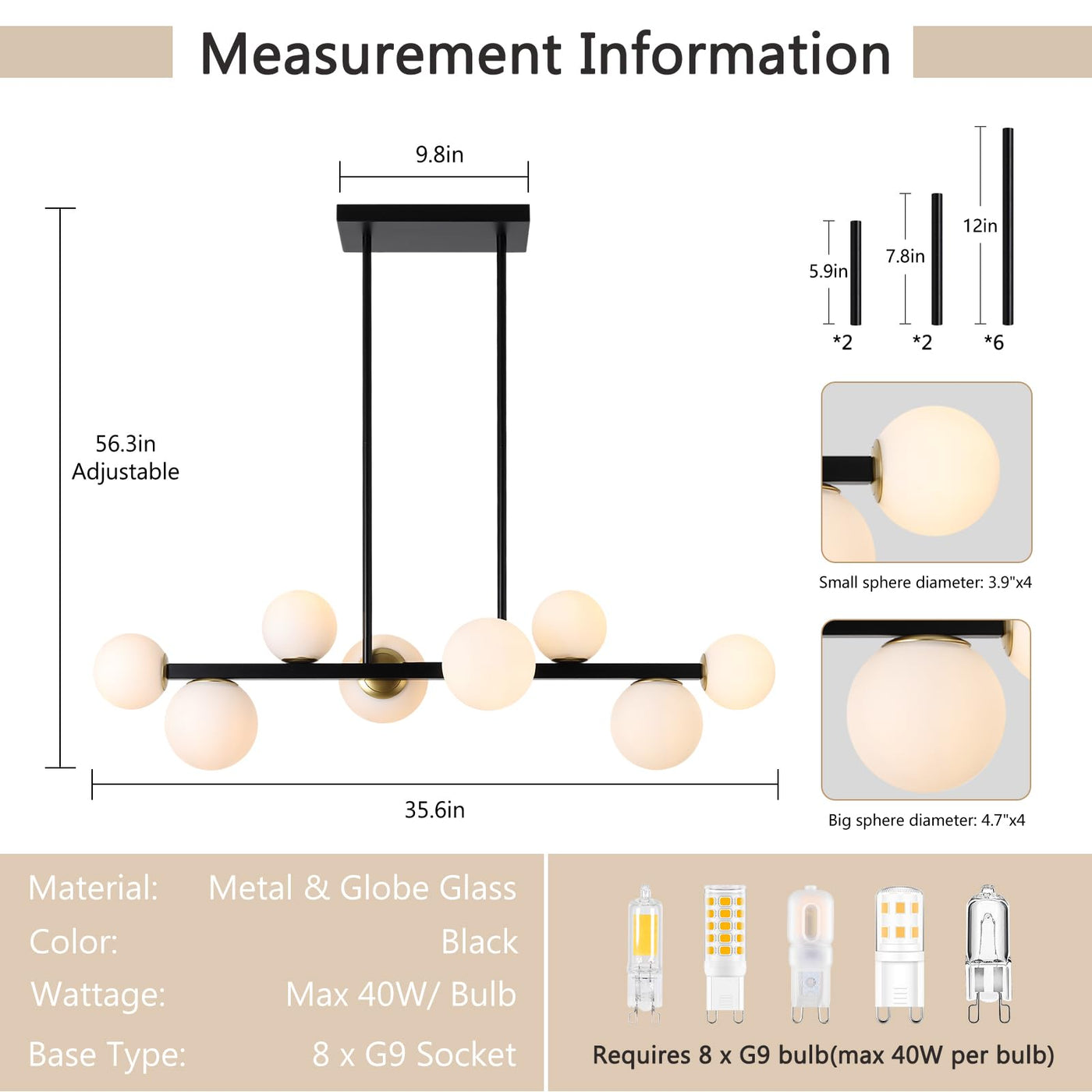 Upgrade your home decor with this beautiful Mid Century Modern Chandelier! With its 8 lights and adjustable height feature, this linear chandelier is perfect for brightening up any space, no matter the size. The matte black body and milk globe shade add a stunning touch to your dining room, while the 35.6 inch length creates a spacious feel. This globe chandelier is perfect for those who love mid century style decor and want to add a touch of elegance to their home.