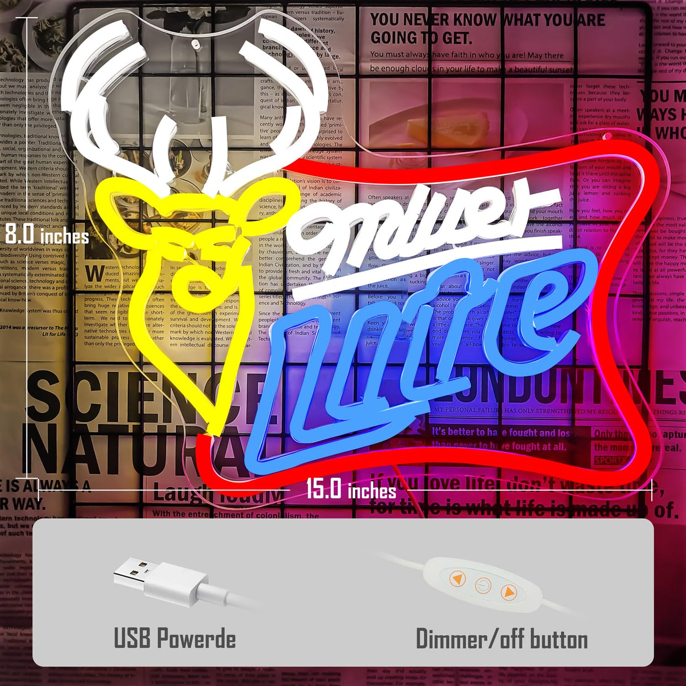 JooeTuu Dimmable Beer Neon Sign - Yellow Deer Wall Decor for Man Cave, Bar, Pub, Bistro - Miller Lite Lighted Sign