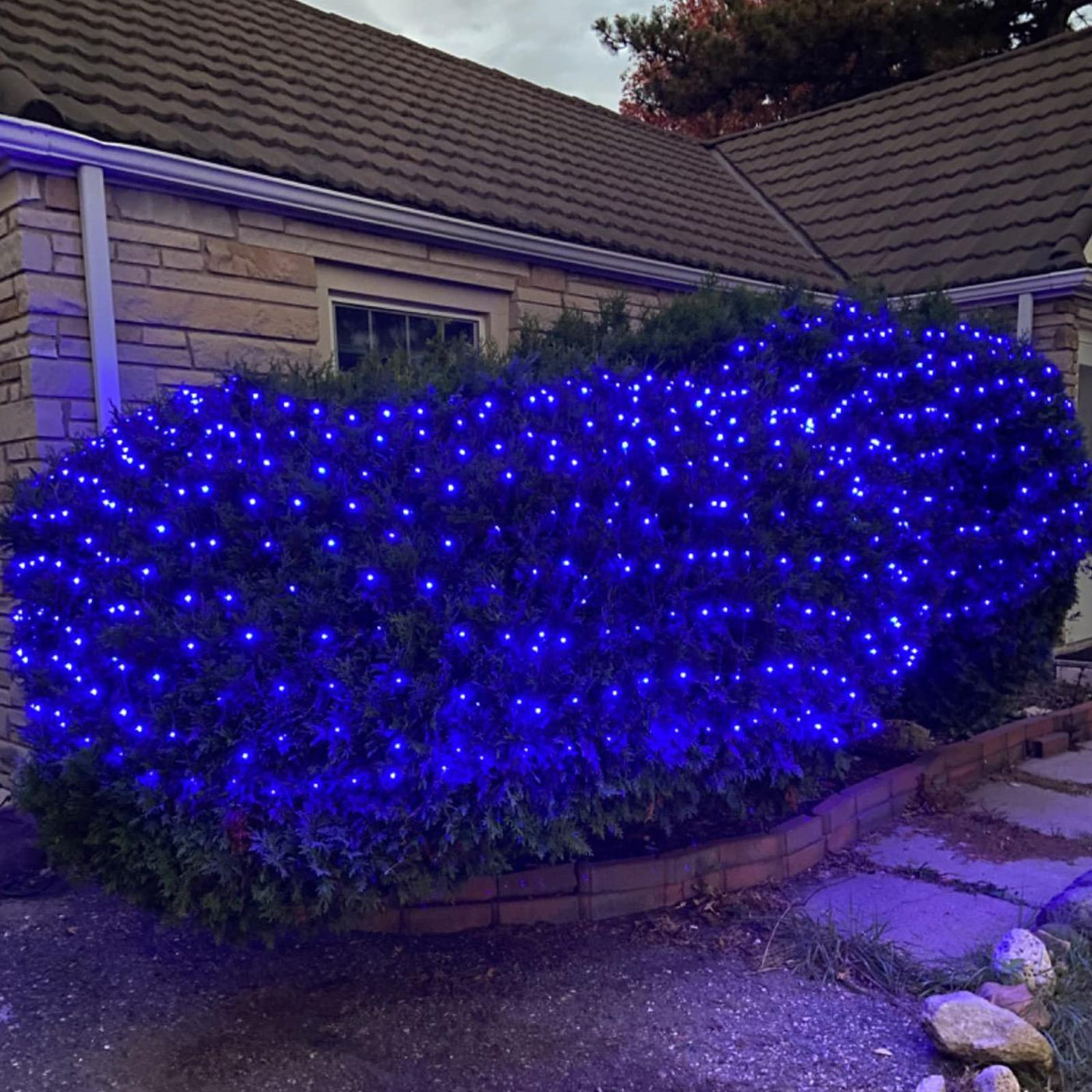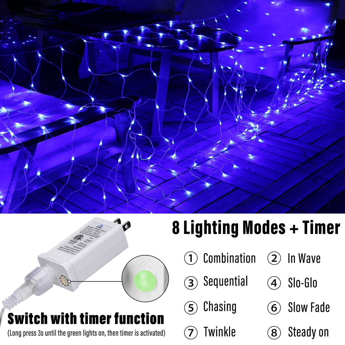 360 LED Connectable Christmas Net Lights, 8 Modes Mesh Net Lights Waterproof For Christmas , Festival, Wedding, Holiday, Party, Event Decorative Specifications: LED Quantity: 360 LED Wire color: Clear Wire Light Color: Blue Setting: Outdoor & indoor Size: 12ft x 5ft Lead wire: 5m/ 16.4ft Input Voltage: 120V~60Hz Output: 30V Watts: 6W Package included: 2 x 360 LED Net Mesh string lights 2 x US Adapter 1 x User Manual NOTES ?This product should not be left unattended. The power-cord of the light-set cannot be replaced; Where breakage or damage to the cord occurs, the light-set must NOT be used/energized but disposed of safely. ? DO NOT use this light close to any source of heat. ? This product is not a toy. Keep it out of each of children. ? DO NOT hang objects from an electrical cord or copper wire. ? Keep the power adapter away from any source of water