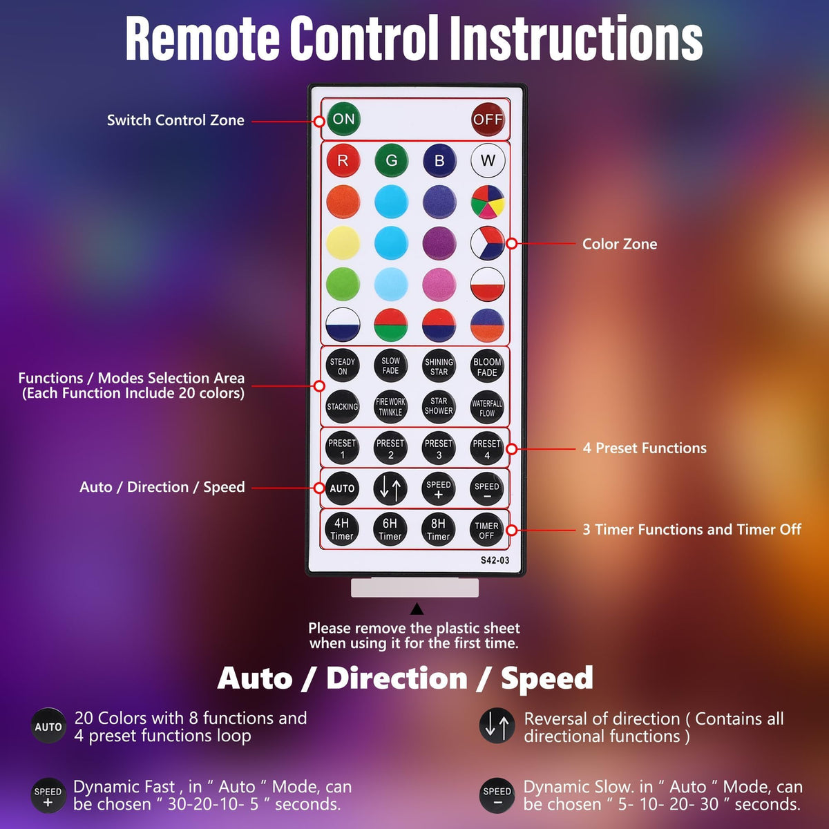 Specifications: Total Length: 82.4Ft Lighted Length: 66Ft Lead Length: 16.4Ft Bulb Space: 0.33Ft Led Quantity: 200 Led Waterproof: Ip44 Wire Color: Dark Green Light Color: Kinds Of Colors Package Included: 1 X 200 Led Rgb String Lights 1 X User Manual 1 X Remote Controller Features: Multi Lighting Modes W:Cool White Muti Color Buttons Can Be Pressed 3 Times To Reflect Different Colors: Muti Color 1 (Press The First Time): Red,Yellow,Blue,Green,Purple Multi Color 2(Press The Second Time): Red, Green,Light Purple Multi Color 3(Press The Third Time) : Red, White,Blue Auto: 7 Functions Auto Cycle Fade: (Gradual Change In 10Colors) Jump: (Auto Change In 10 Colors) Asyn 1: (6 Kinds Of Mixed Color Flash Modes) Asyn 2:(Alternate Lashing In3 Color Modes) Twinkle: (Alternate Twinkle In 3 Color Modes) Strobe:(10 Kinds Of Mixed Colors) In Waves:(Gradual Change In Single Color&Mixed Color) 6H/8H Timer Function 6H: 6Hours Timer ( 6H On+18H Off) 8H: 8 Hours Timer ( 8H On+16H Off) Set A Timer According To Your Needs, And Lights Will Be On/Off As Scheduled Once The Timer Set Up.